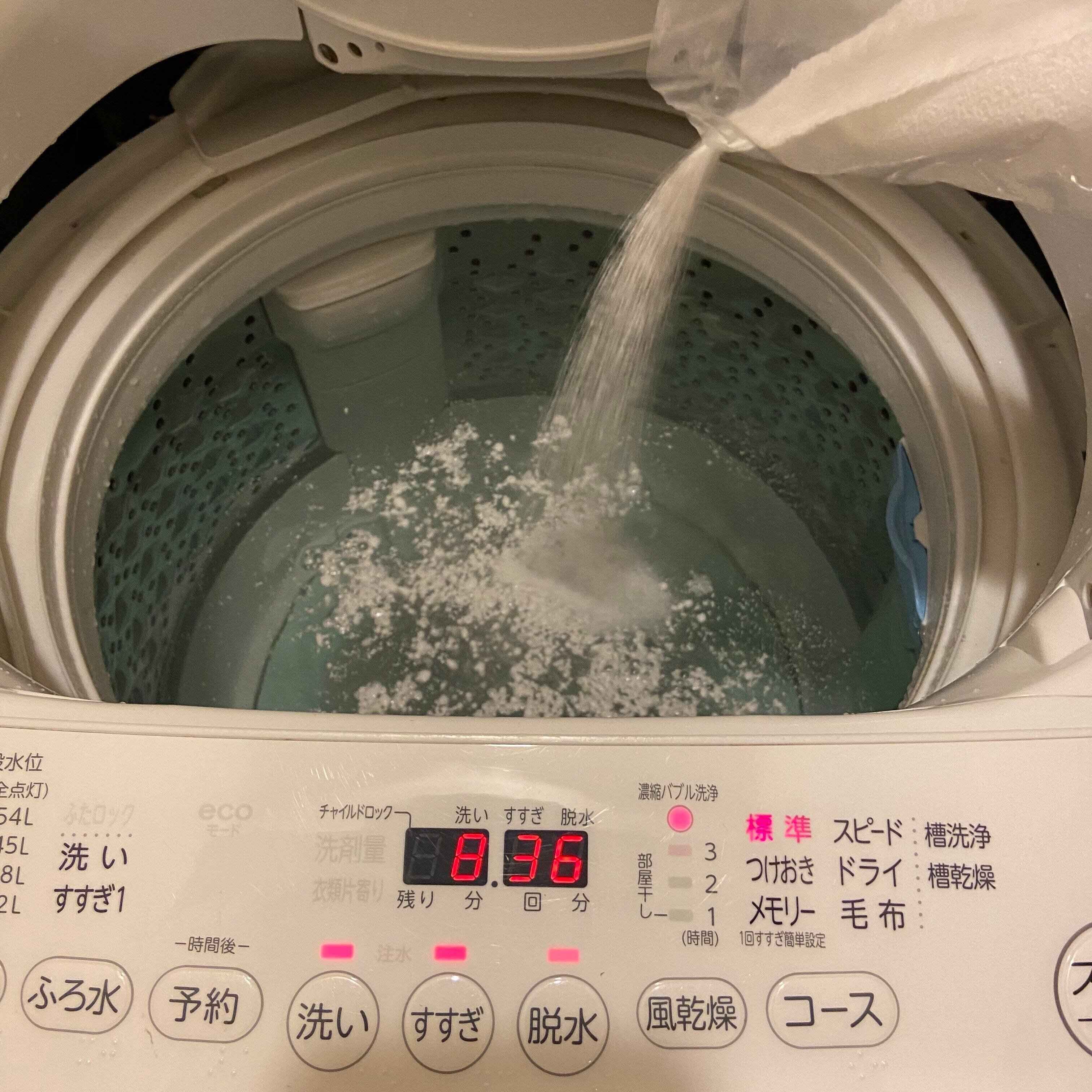 3、4分ほど回転させて粉が溶けたら、そのまま洗濯機の電源を切って4時間ほど放置します。汚れが気になる時はさらに放置することもあります。