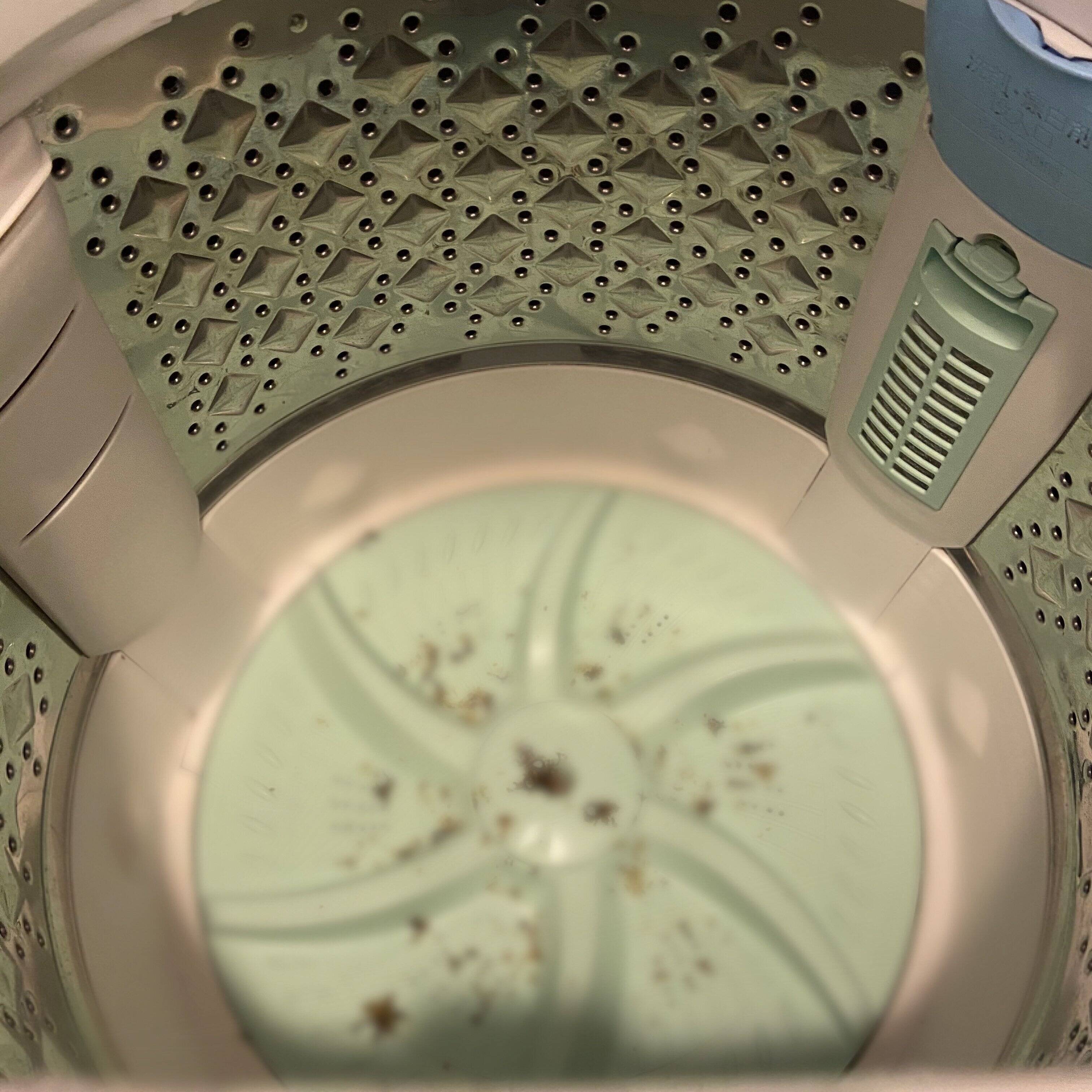 黒い汚れは、ウエットティッシュで取れるだけ拭き取りました。そのあと何回か洗濯機を回しましたが、少しずつ黒いモノがまだまだ出てきました。