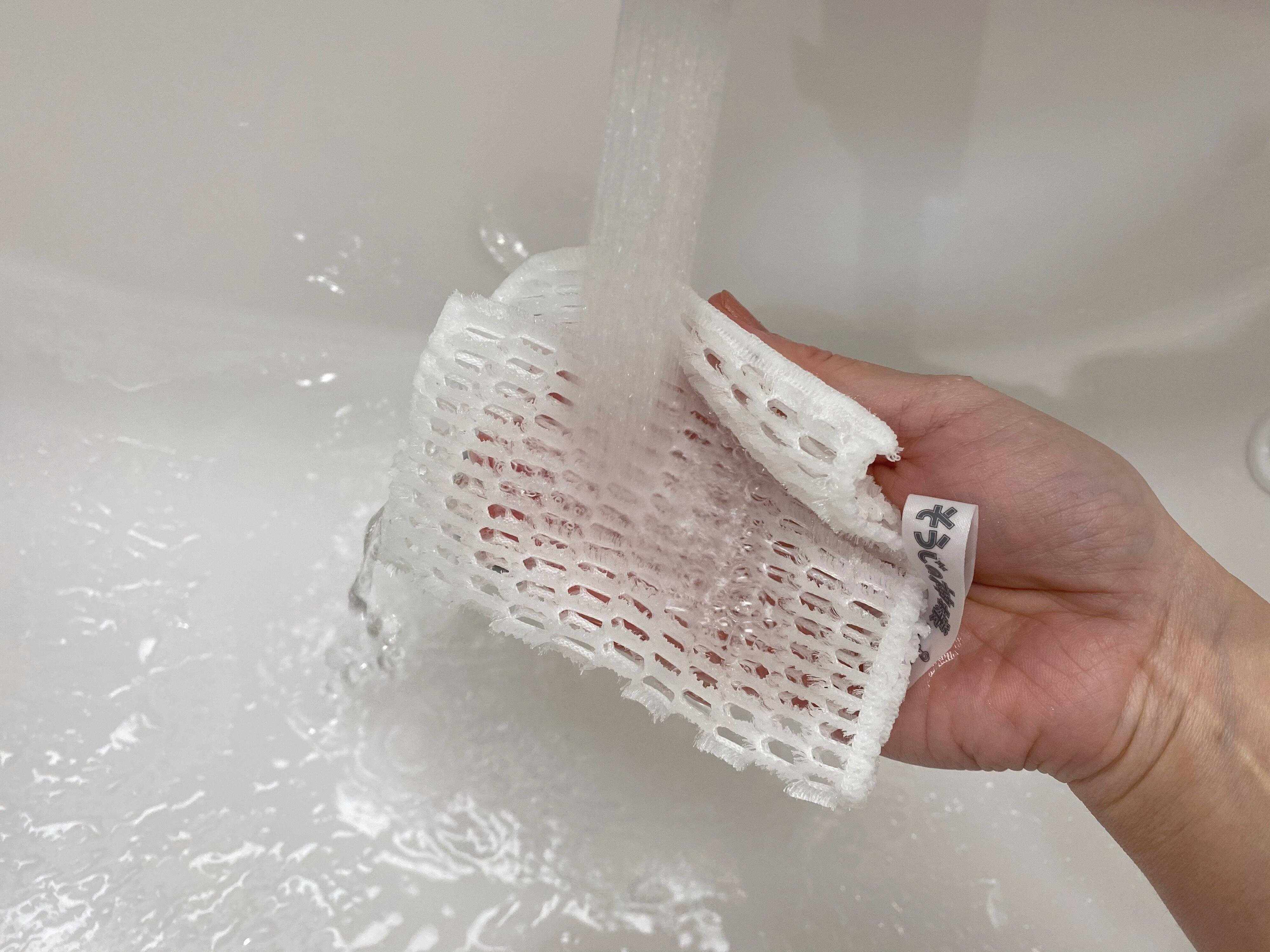 このあみたわしは「洗剤不要」と謳っているだけあって、洗面ボウルにお湯をかけてこするだけ!