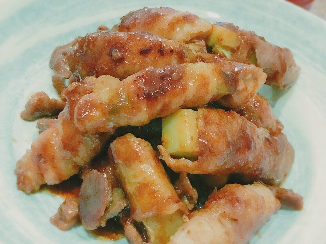 ブロッコリーの茎を豚肉で巻いて、フライパンで焼いたら甘辛たれをからめるだけ。
