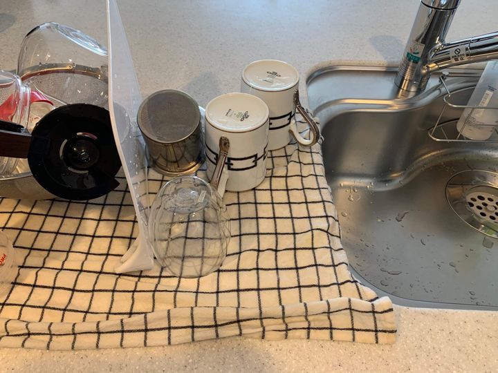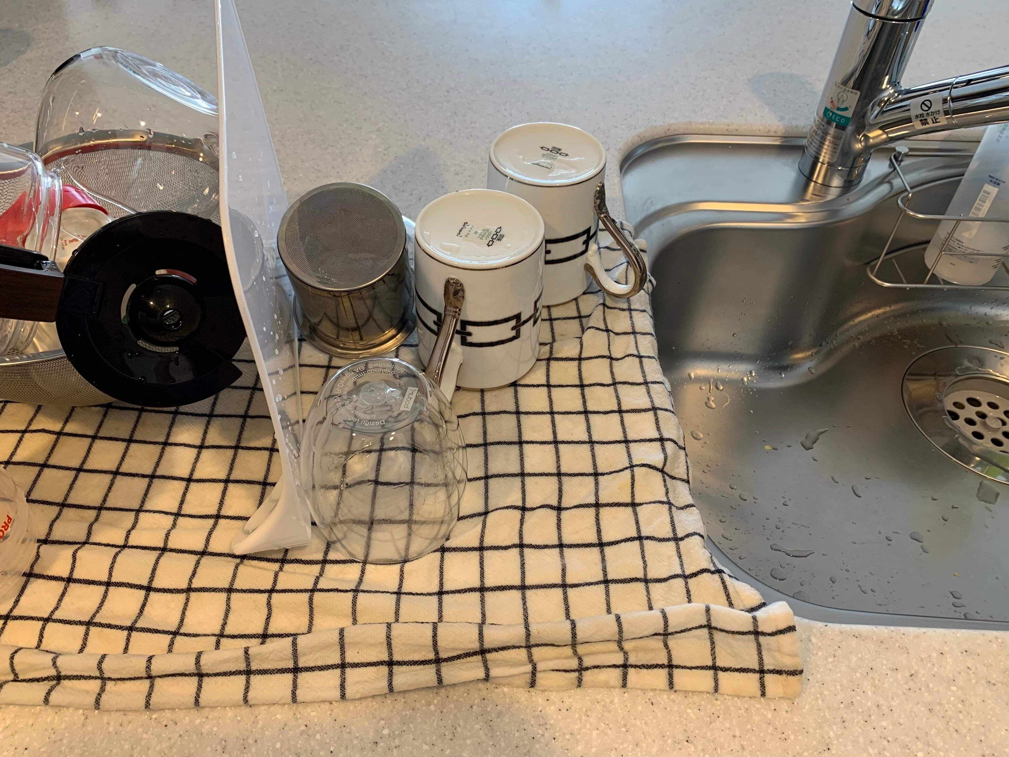 洗い物は基本的に食洗機で、フライパンやまな板など食洗機に入らないものは手洗い。ふきんの上で水をきり、拭いてしまいます。濡れたふきんでキッチンの汚れをついで拭きして完了です。水切りかご自体を掃除することもないのでおすすめです。