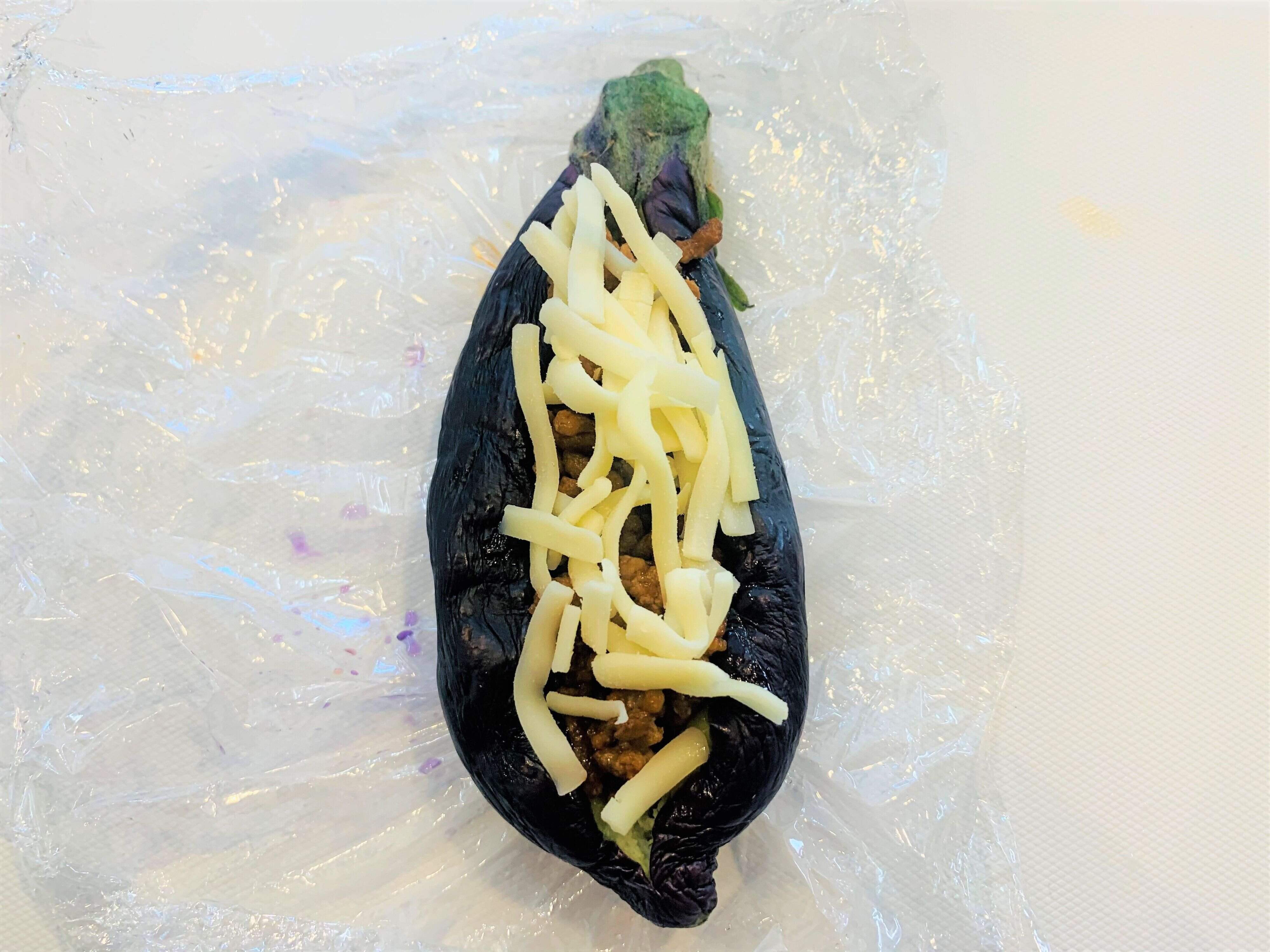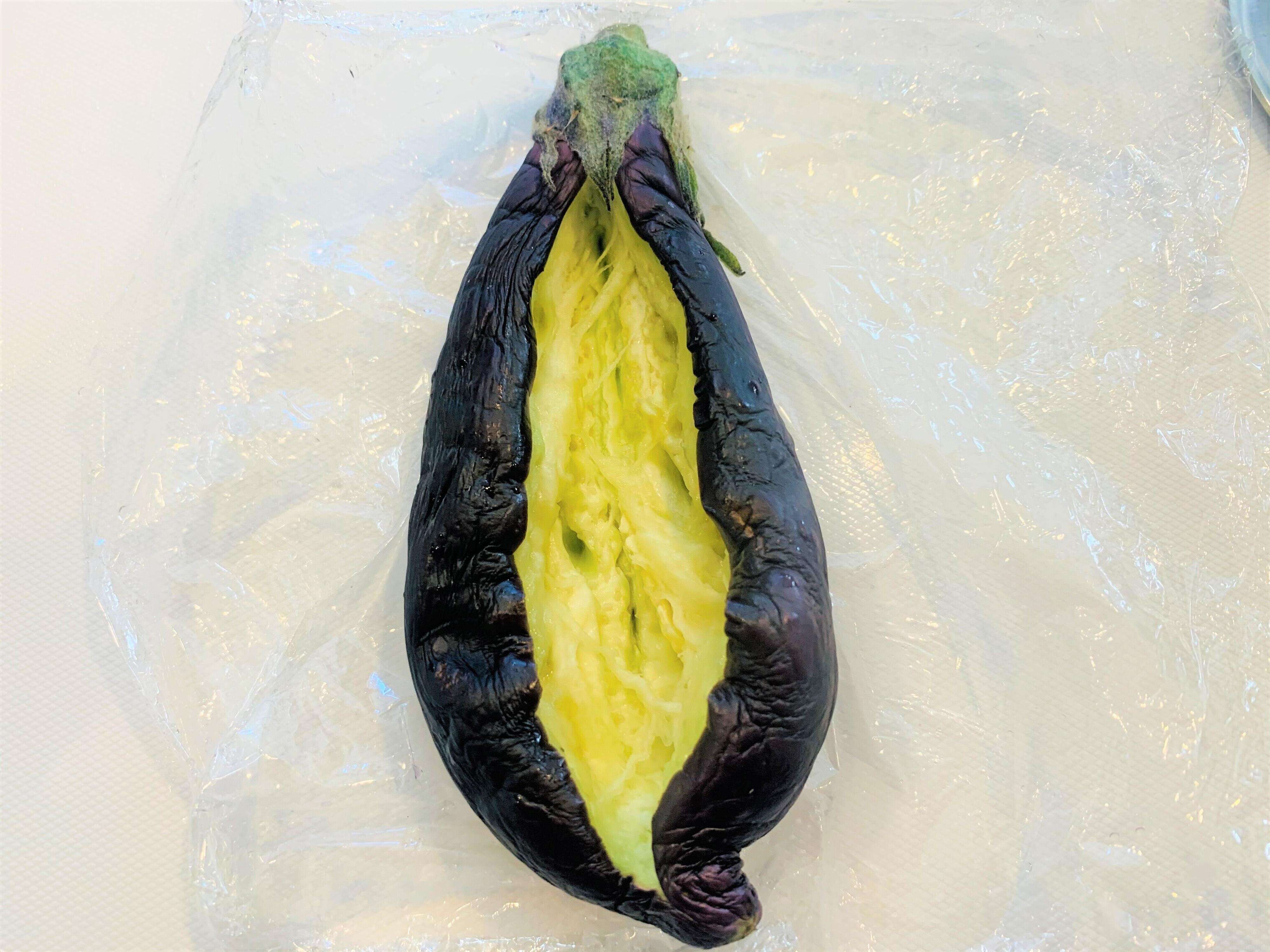 1.なすの表面に楊枝などで10ヵ所くらい穴をあけ、ふんわりラップで包んでレンチンします。2本分600Wで3分前後。加熱しすぎないように、2分半スタートで様子を見ます。