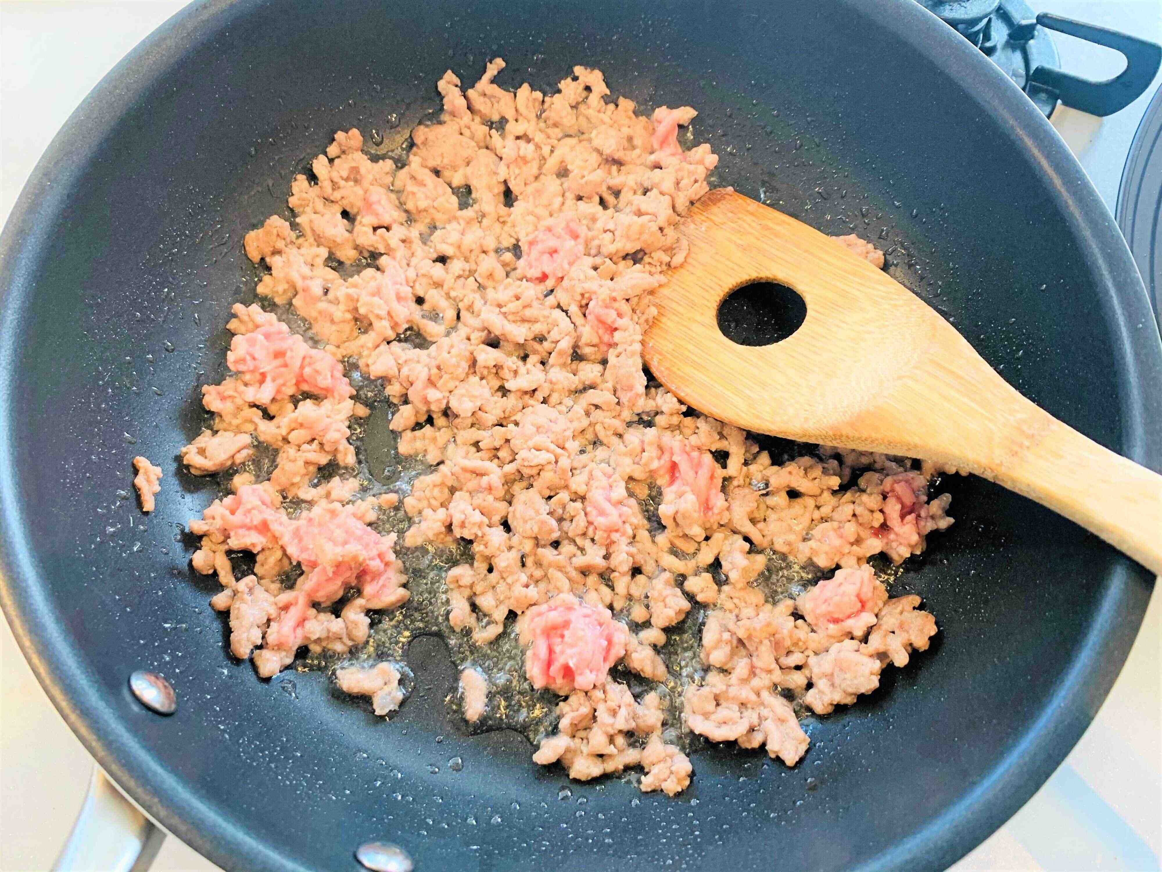3.フライパンでひき肉を炒めます。(なすをレンチンする前にひき肉を炒めておくのもよいです。)