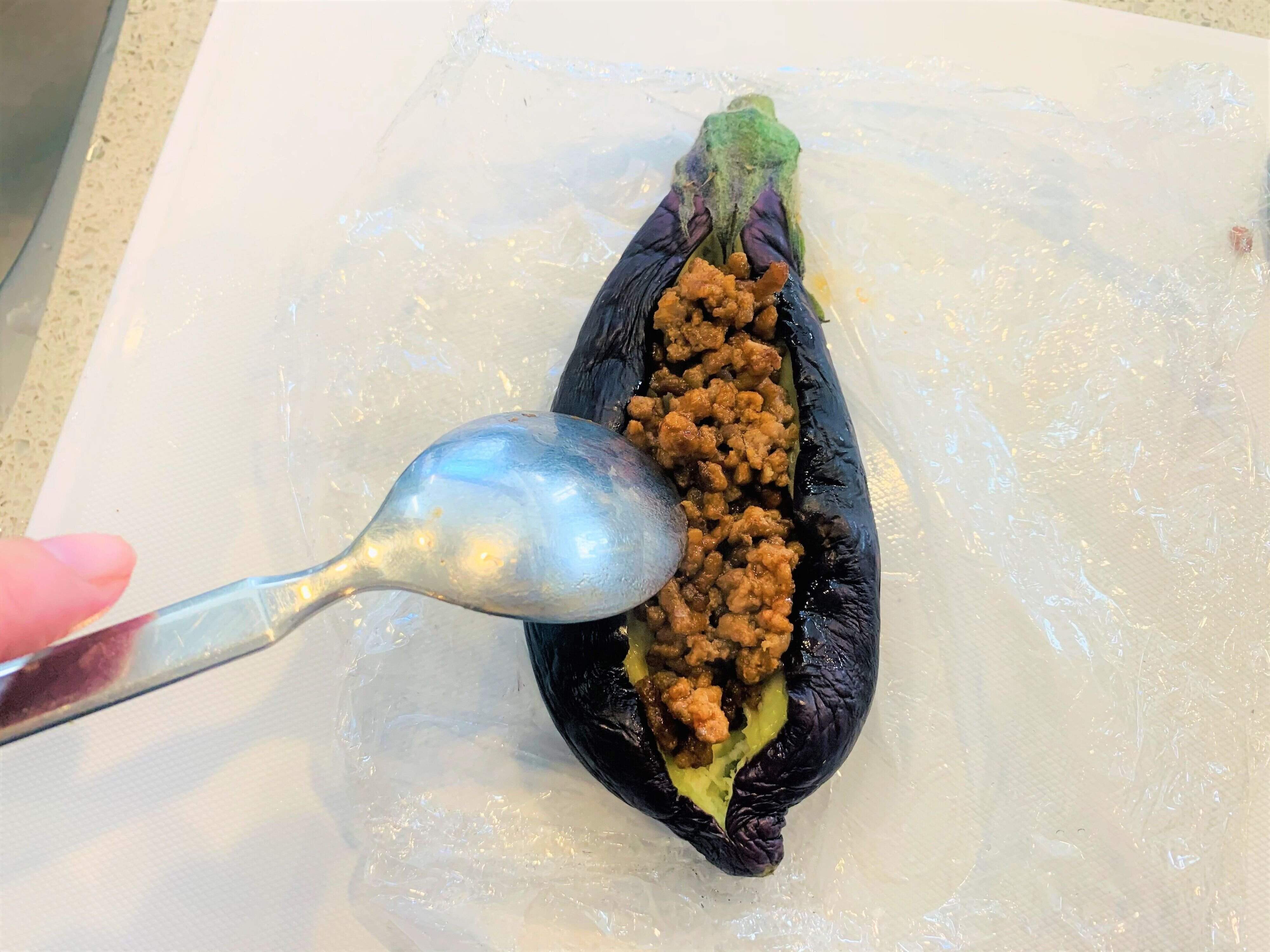 丸ごとガブっといただきます。なすがトロトロジューシー、お肉の濃いめの味つけとよく合いおいしいです。