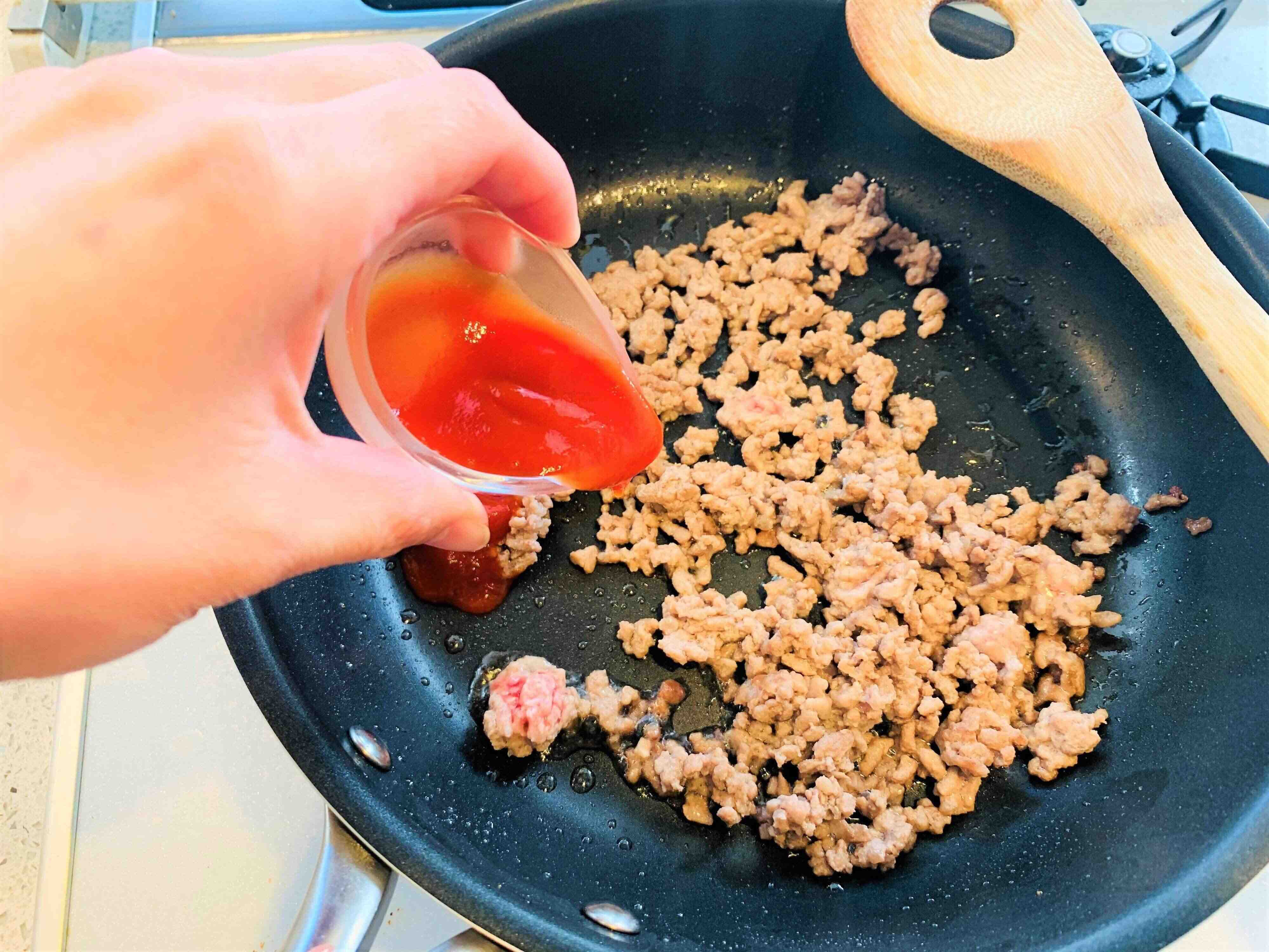 4.ケチャップとウスターソースで味つけします。これで簡単なミートソースができあがり。