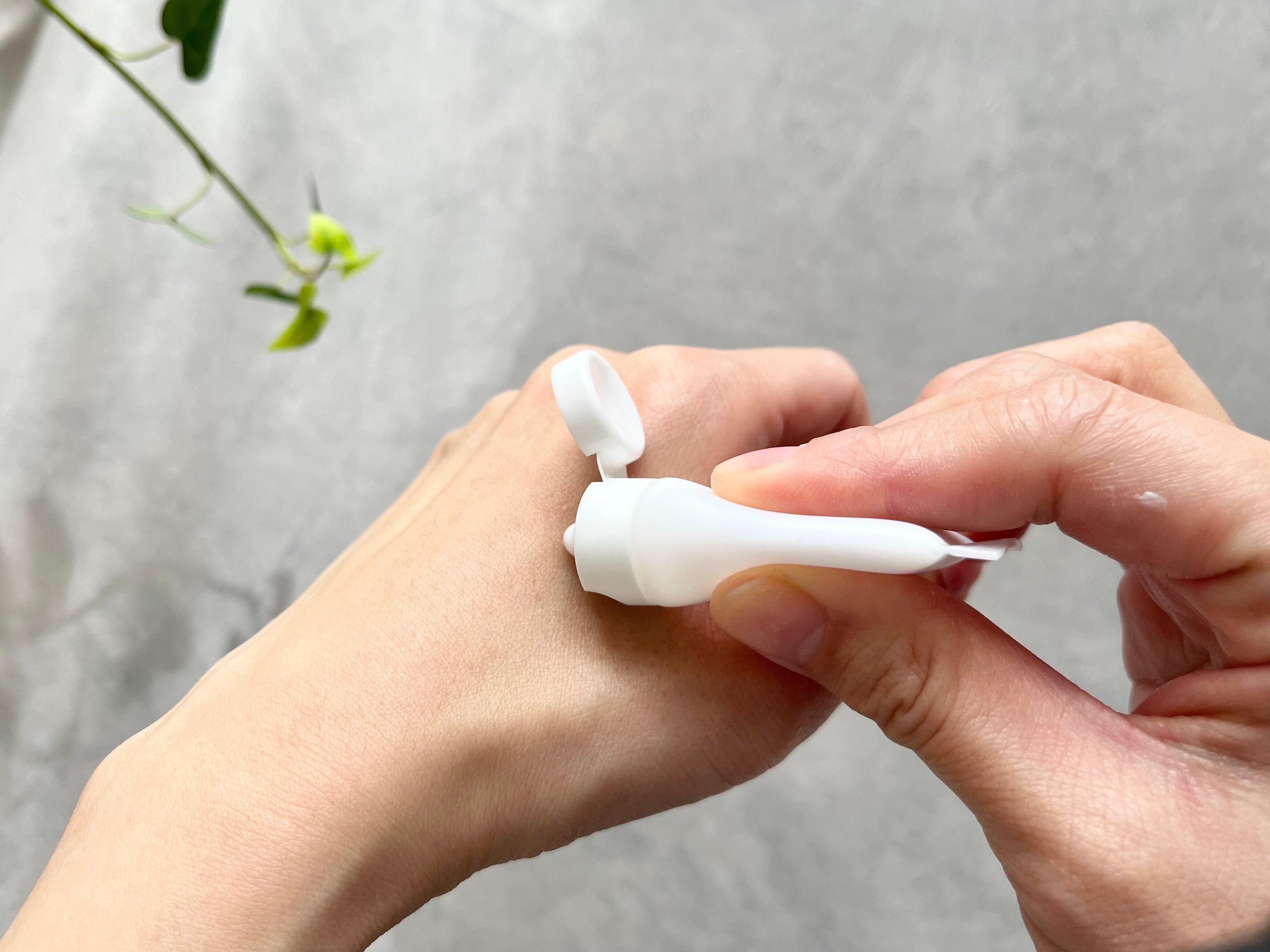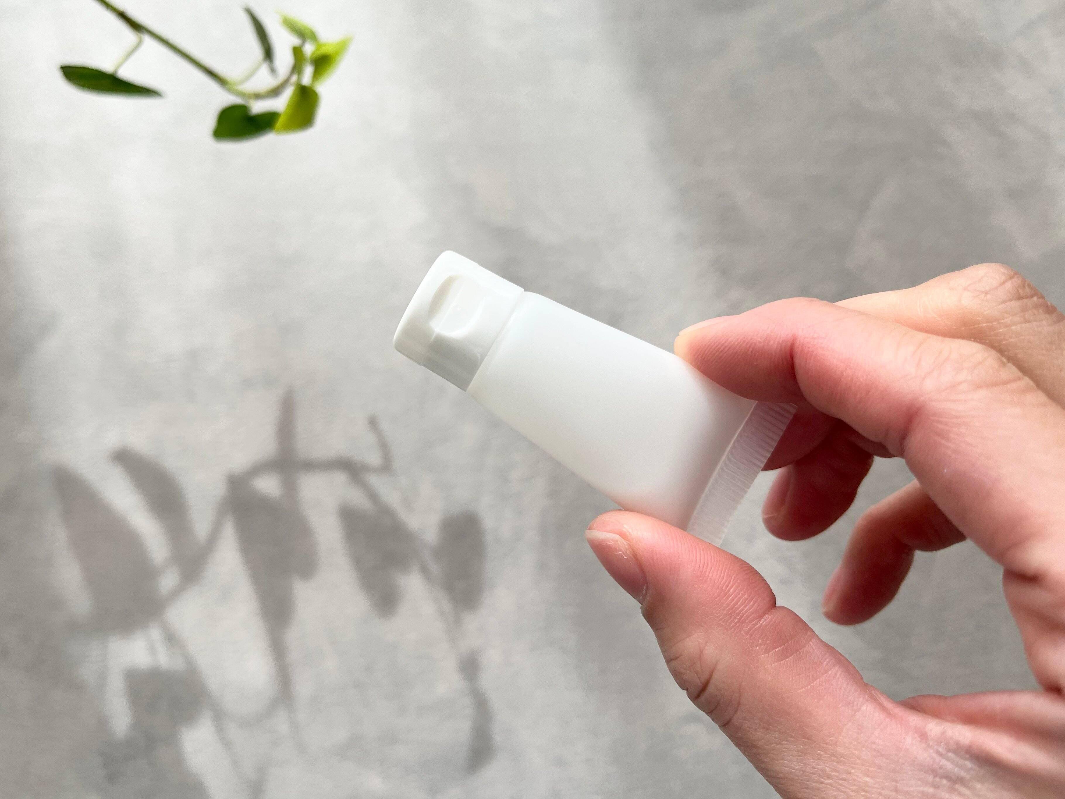 商品のサイズは約3cm×5.7cm×1.7cm。これはリップクリームや目薬ぐらいのサイズなので、ポーチに入れても邪魔にならない大きさです。見た目はハンドクリームそのものをそのまま小さくしたようなデザインをしています。