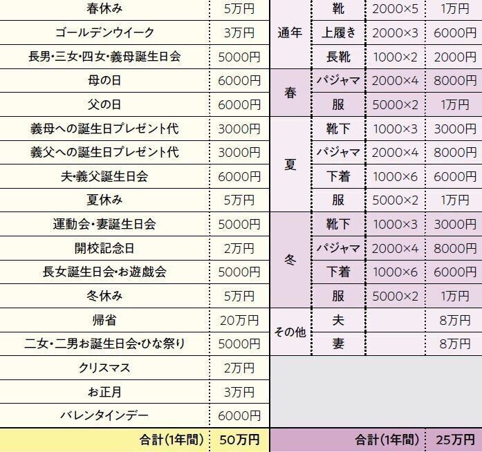 「意外とかかるのがパジャマや靴下、靴、下着類。季節ごとの予算だけでなく、補充する枚数と単価目安も書いておけば迷いません」。