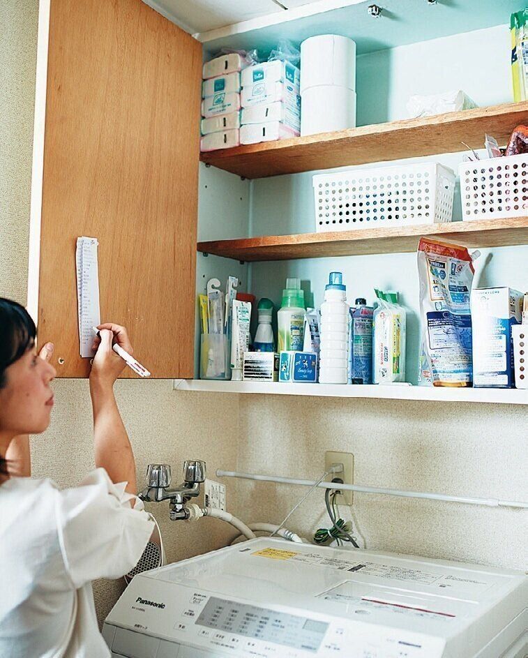 日用品のストックはこの棚に。「リストを印刷して棚の内側に貼っています。それぞれ最後の1個を棚から出すときに◯をつけ、そのまま買い物時のメモに。必要最低限の出費ですみます」。