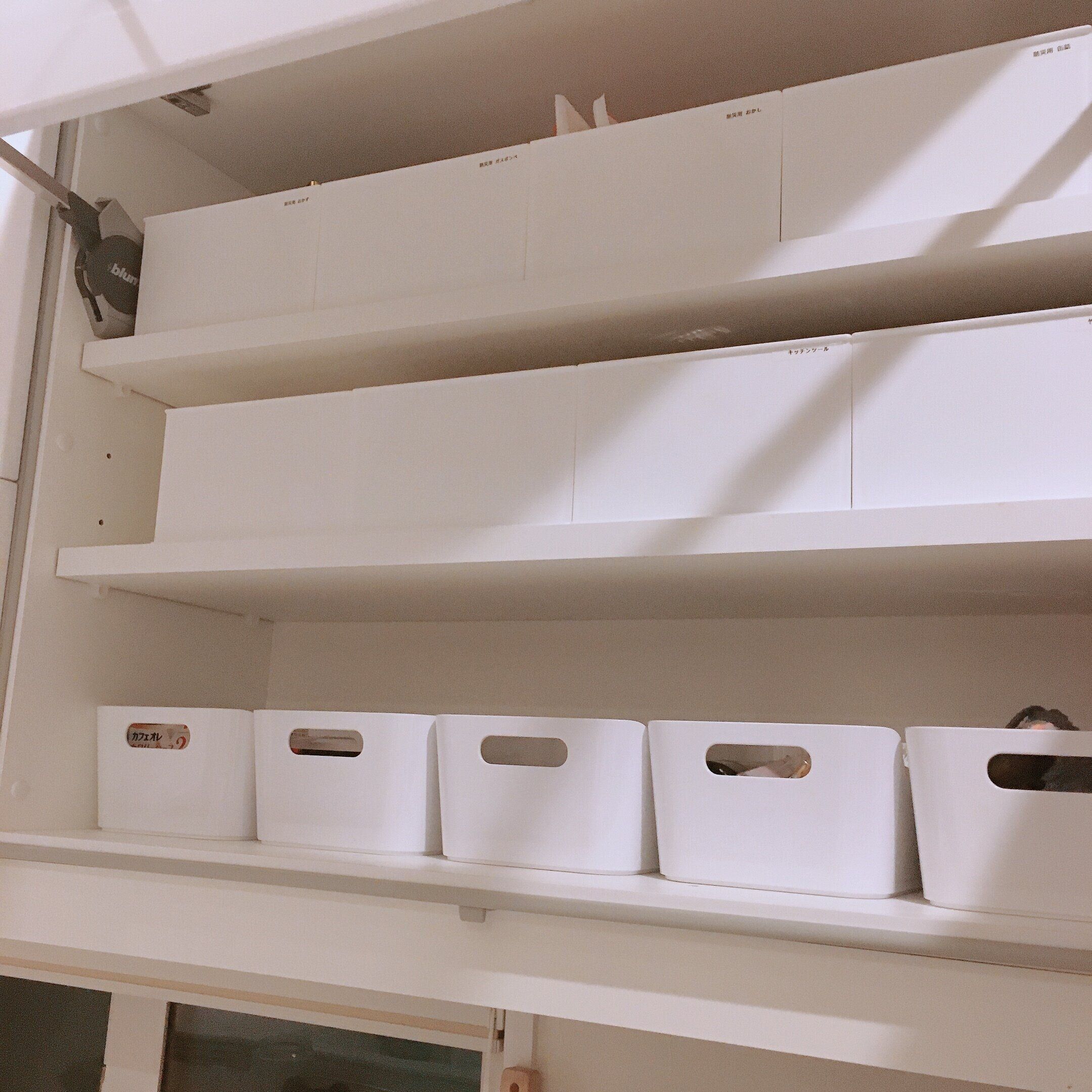 ニトリのNインボックスの一番小さいサイズのモノに入れ、カップボードの一番上に収納しています。