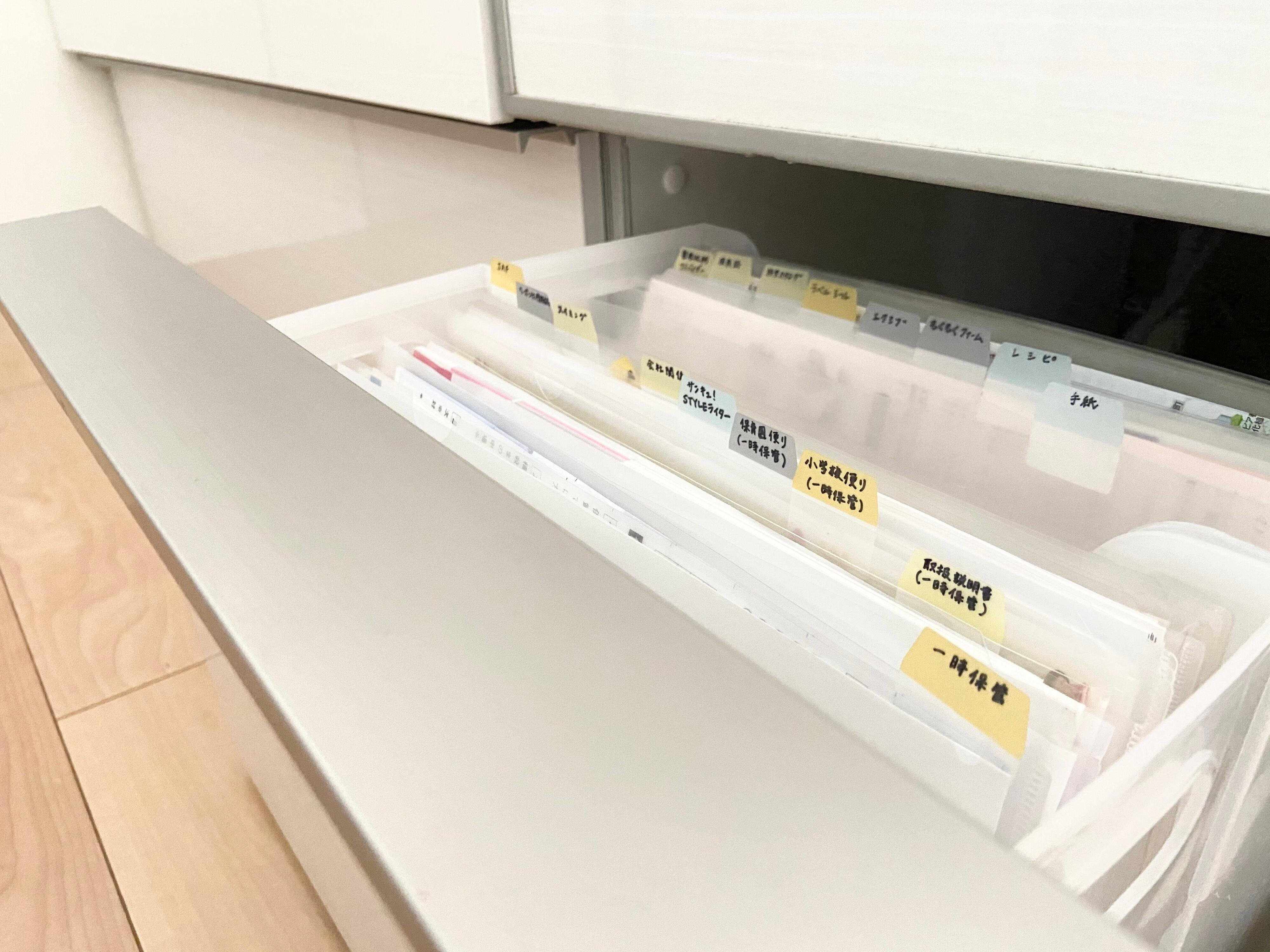 我が家ではキッチンの引き出しの1つを書類収納にしていますが、とにかく郵便物や子供達のお便りを開けて確認する場所の近くがオススメです。