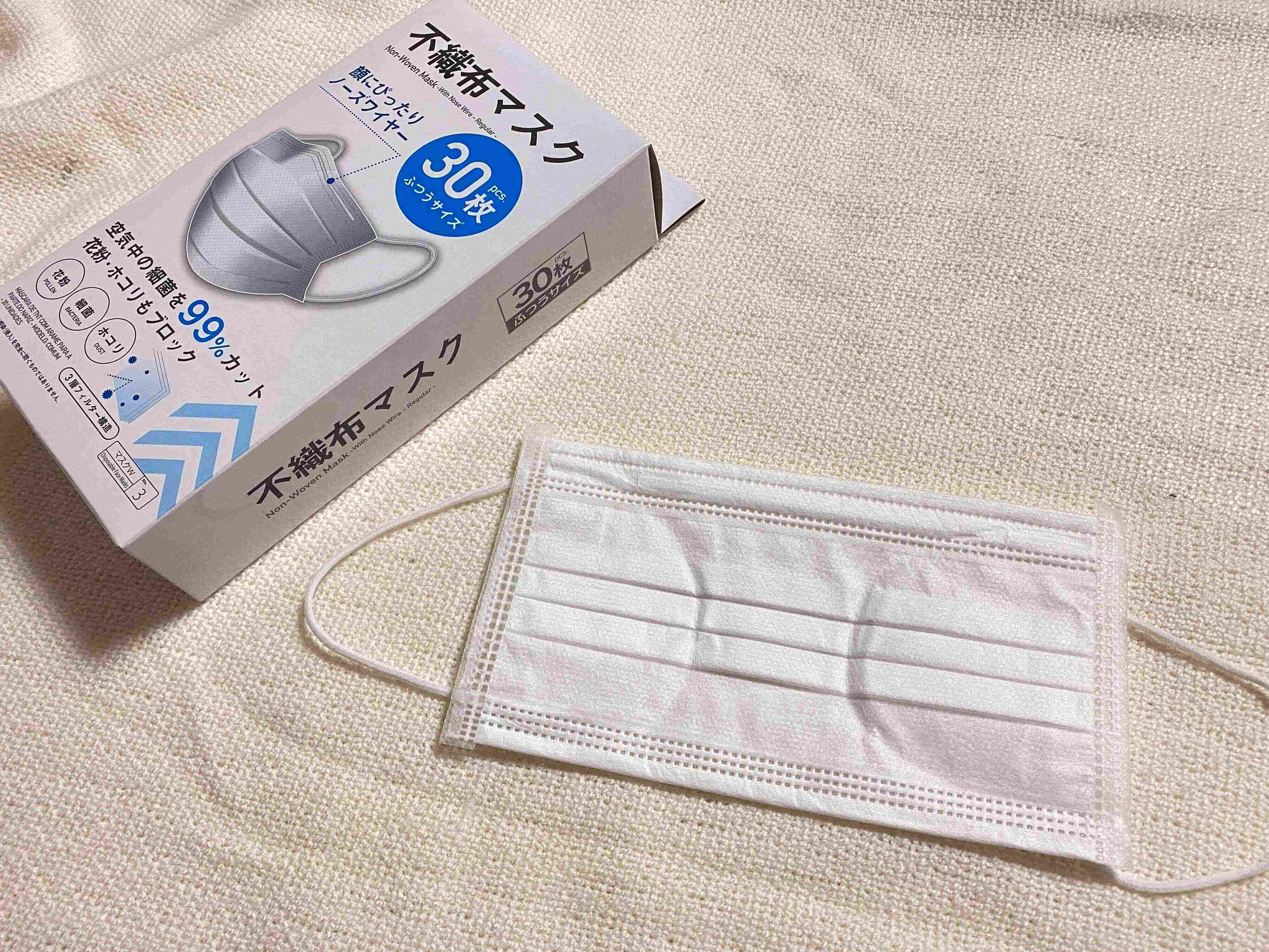 我が家は長年、ダイソーの不織布マスク(110円 税込)を愛用しています。ダイソーだからといって機能面が劣っているわけではありませんよ。使い心地、顔のフィット感ともに一般的なマスクと変わりません。