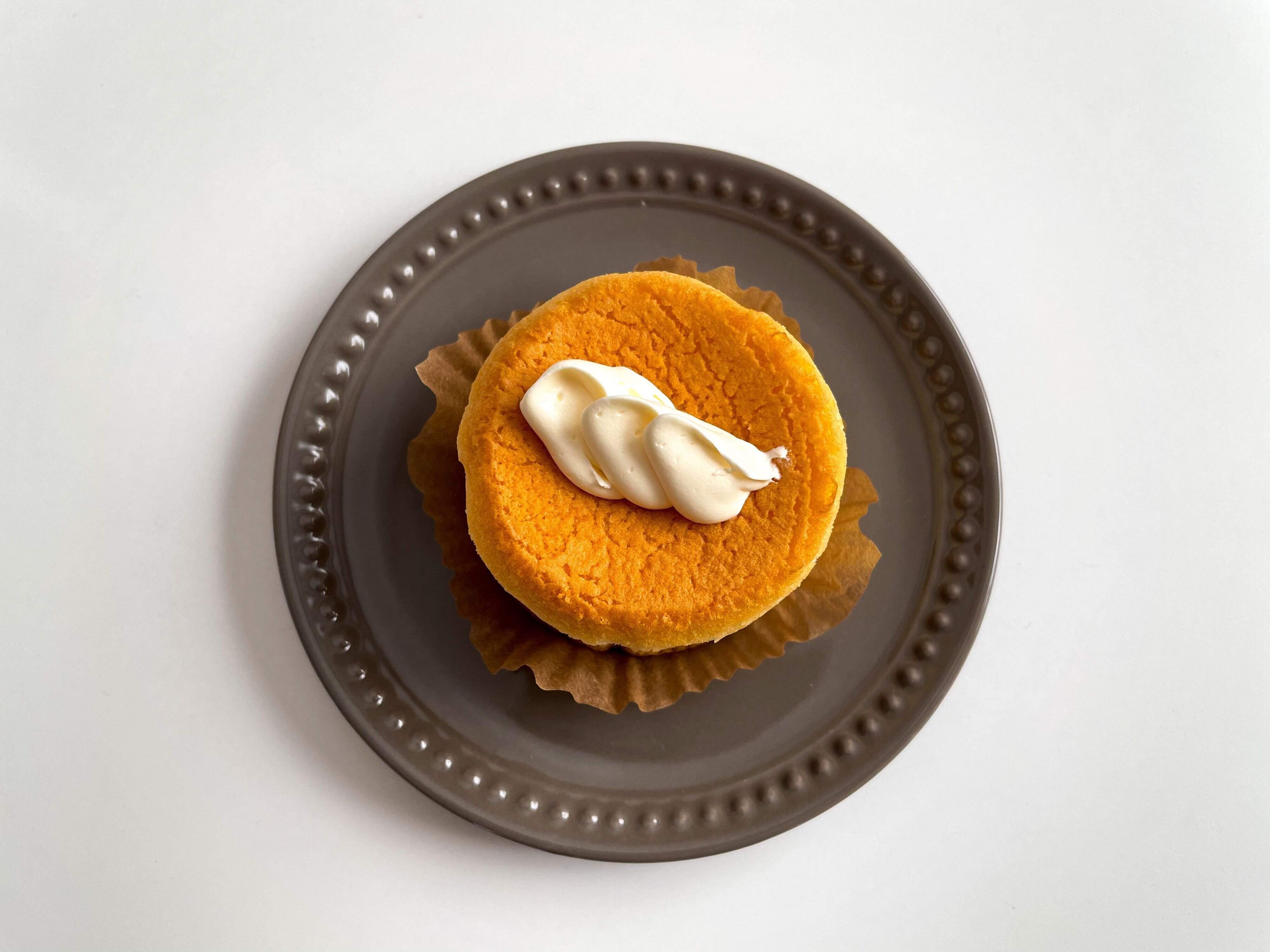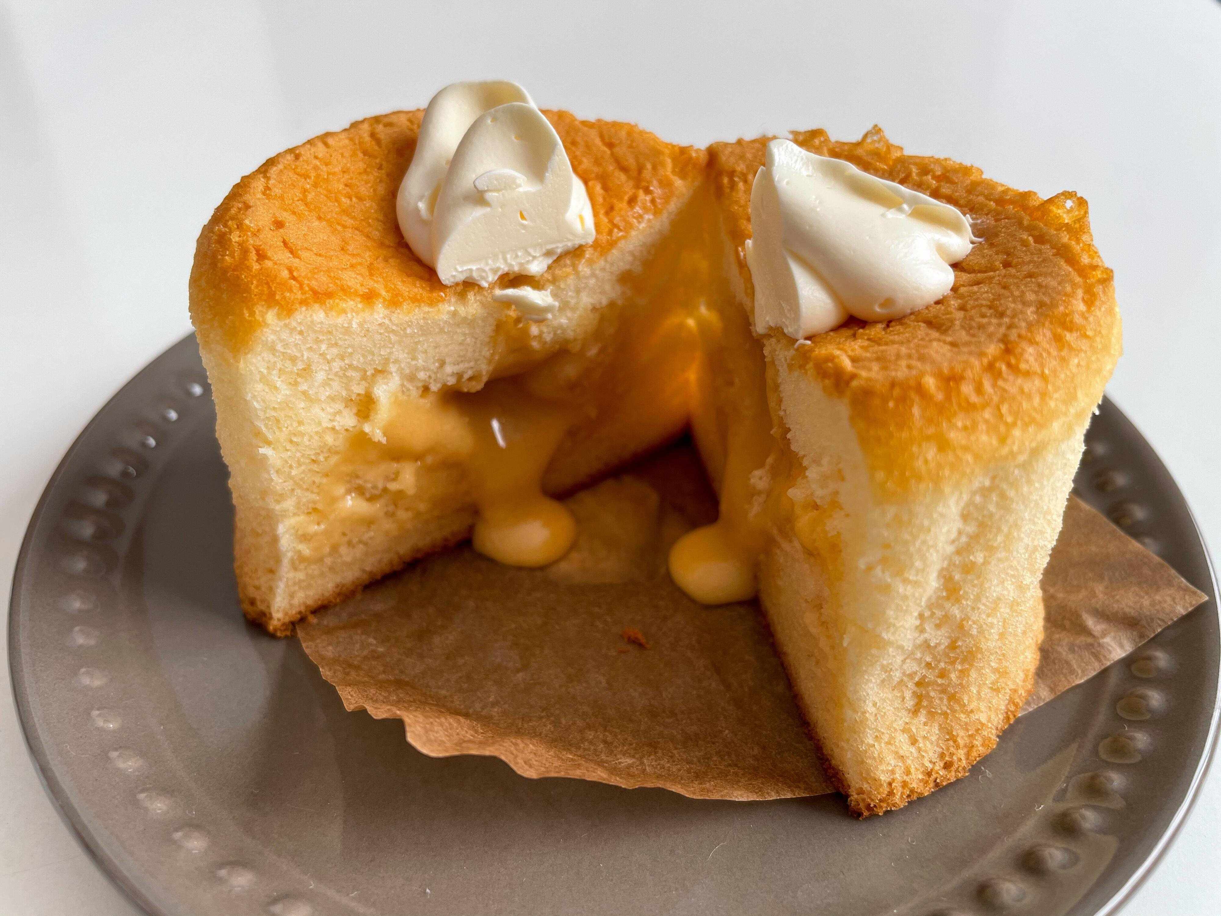 パッケージの蓋を開けてみると、キレイに焼かれたシフォンケーキの上に生クリームのようなバタークリームがトッピングされています。