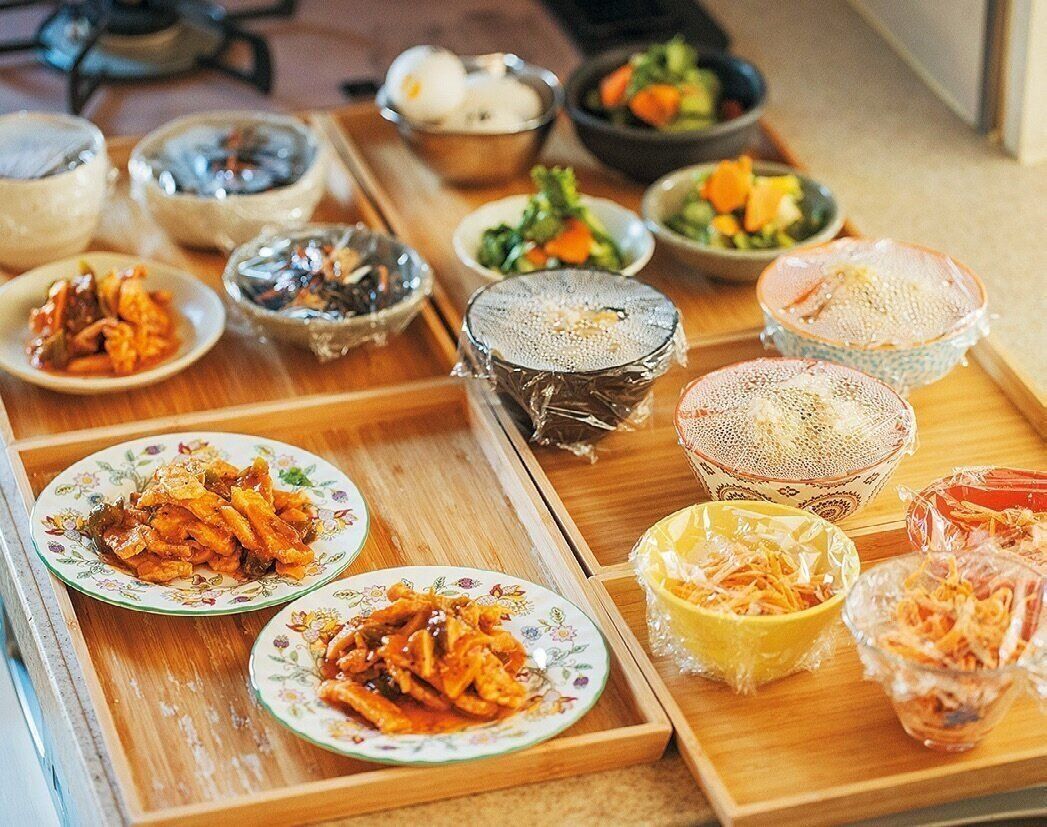平日夫と長女は外で仕事、二女は大学やバイトで帰宅時間はまちまち。前は家族全員で食べていた夕食も、今はバラバラです。おかずは1人分ずつ盛りつけ、好きな物を選ぶ食堂方式に。家族が予告なく外で食べてくる日もあるので、私の分は作らず残った物を食べます。