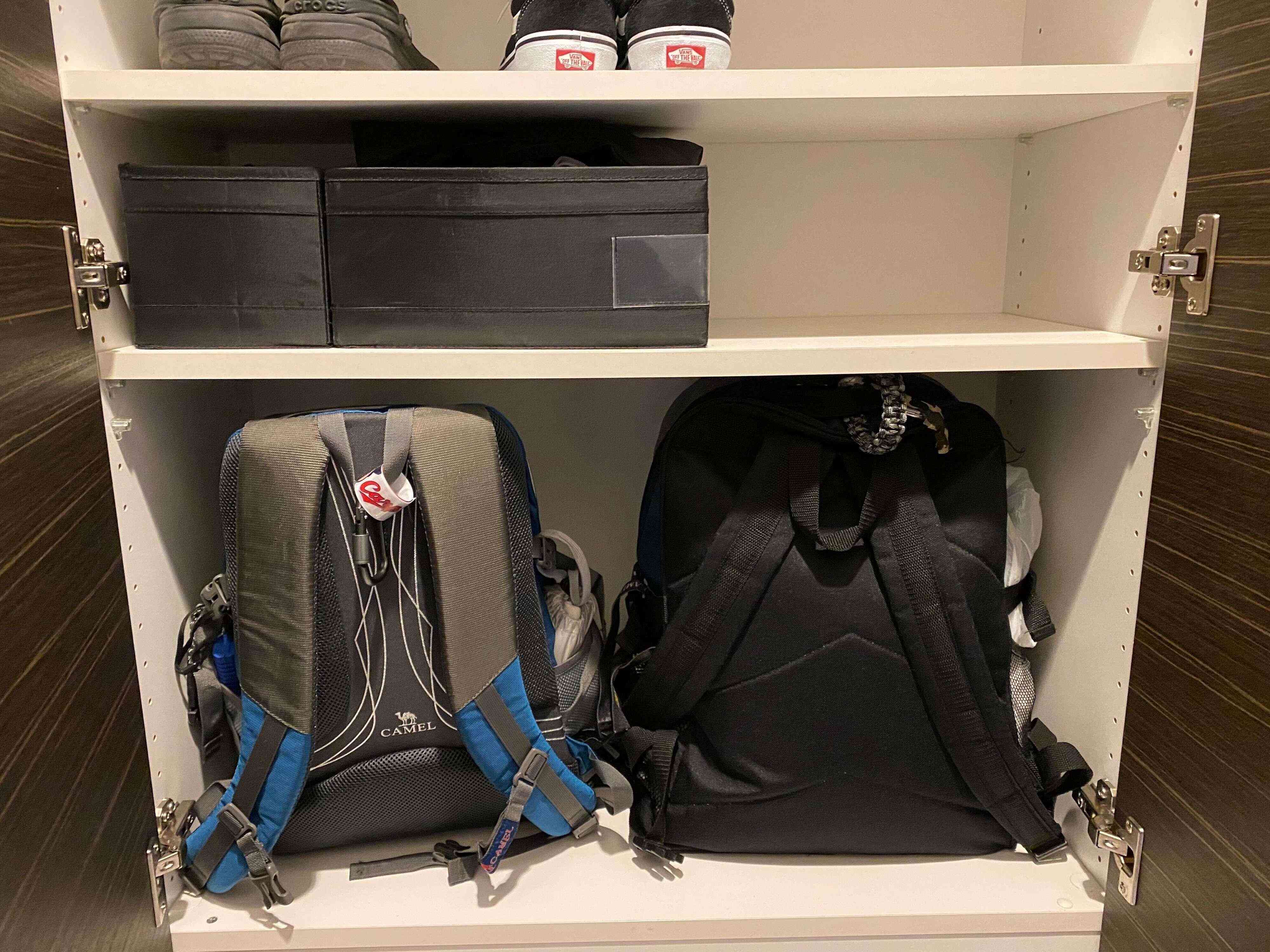 背負いやすいよう肩ひもを手前にして収納すると、とても持ち出しやすくなります。また、デザイン性の高いタイプを選び、あえて収納しないという方法もあります。