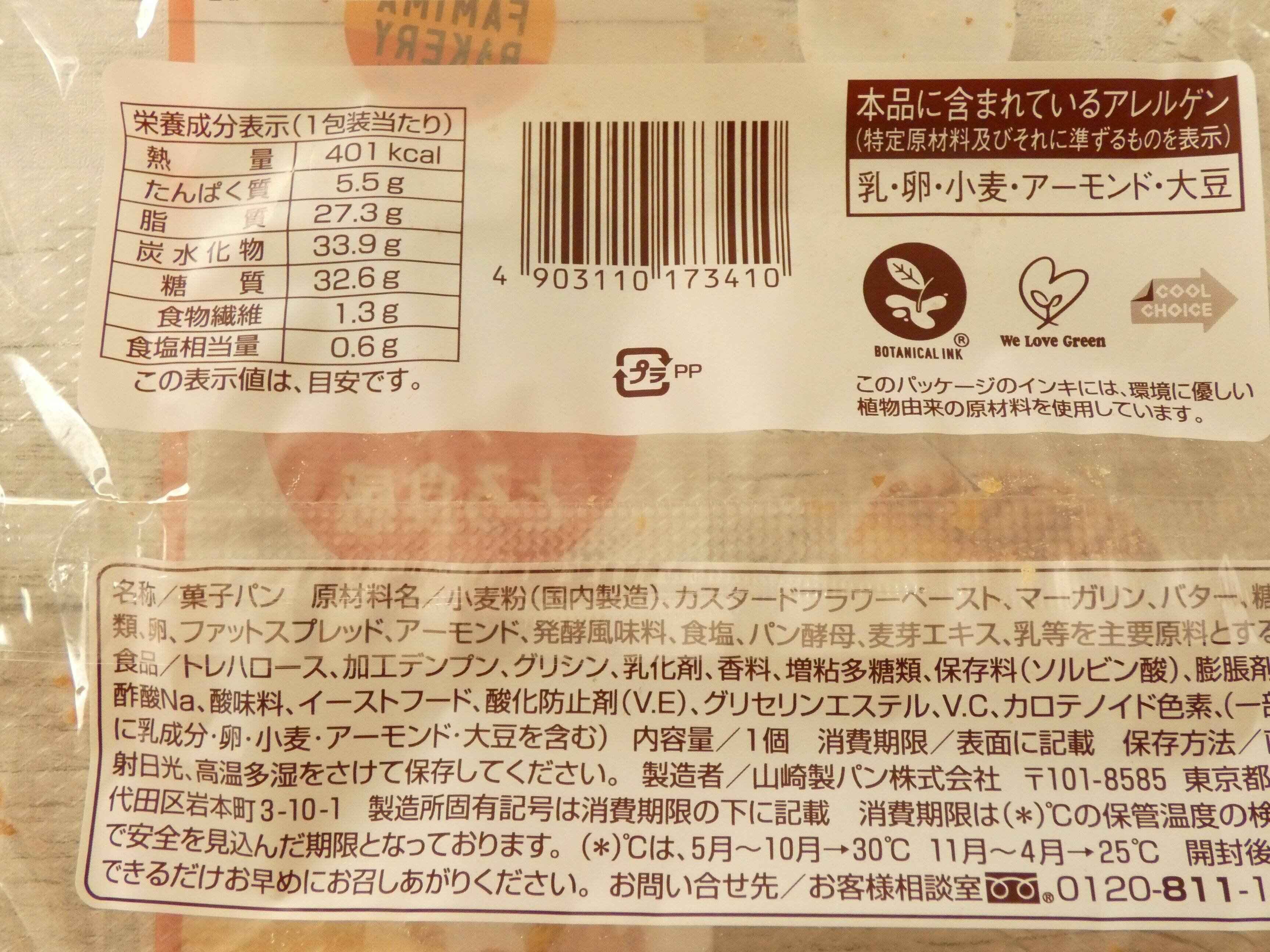 栄養成分表示を見ると1個のエネルギーは401kcal。デニッシュ生地にクリームがたっぷり入っているので、予想通りのカロリーの高さです。