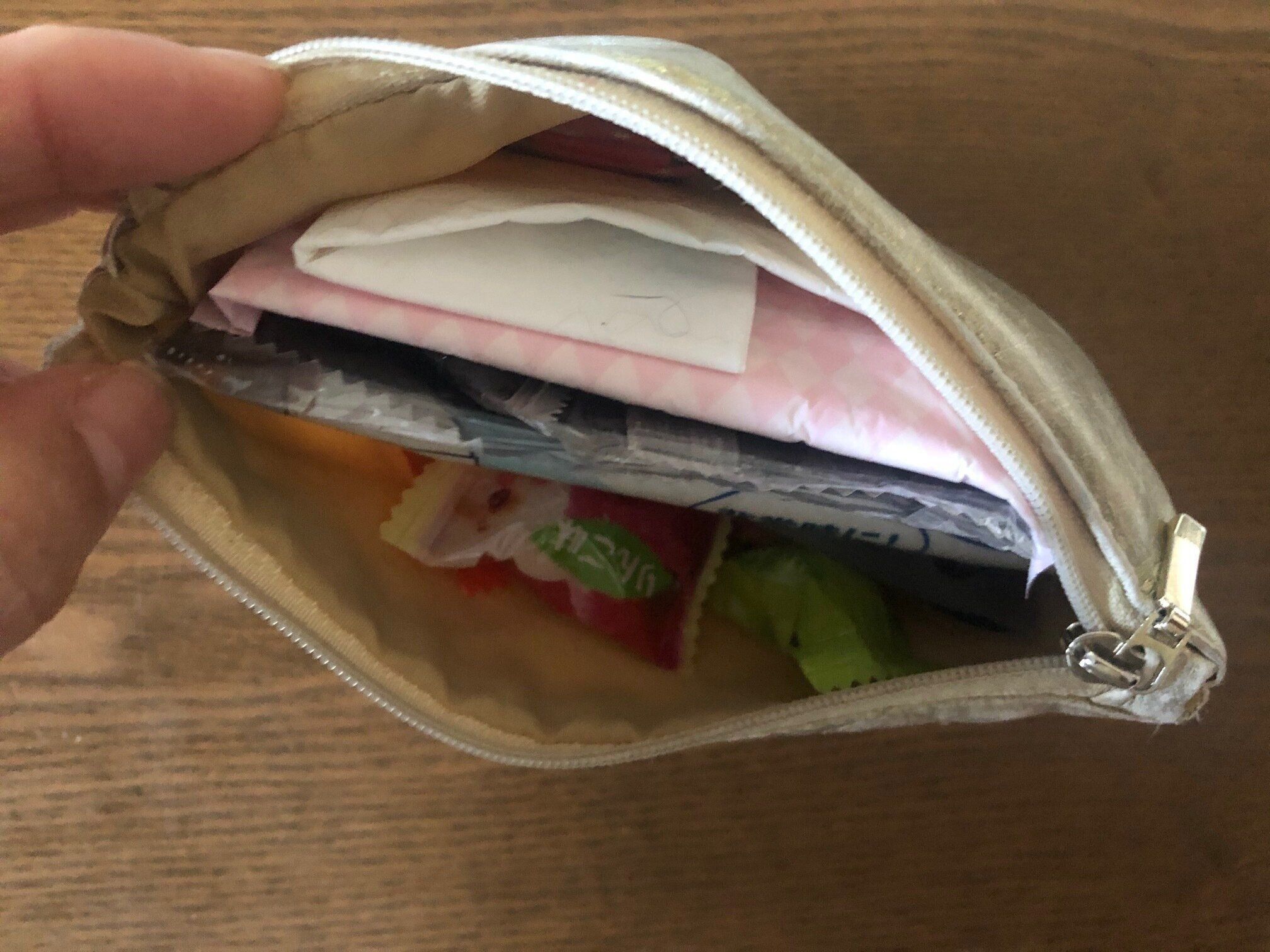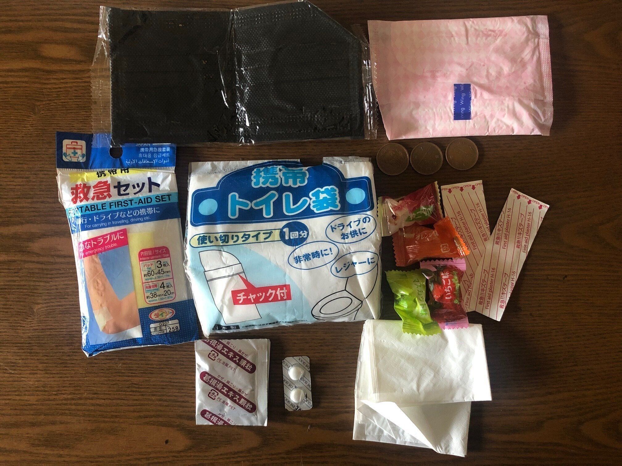 100円ショップなどで購入できるものを中心に、最低限あれば安心かな?というものをポーチに入るだけ入れています。久しぶりに中身を全て出してみましたが、スマホの充電器や小さなホイッスルなどもあった方がいいかもしれませんね。改良の余地ありです。