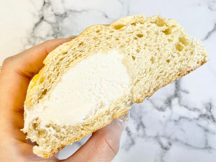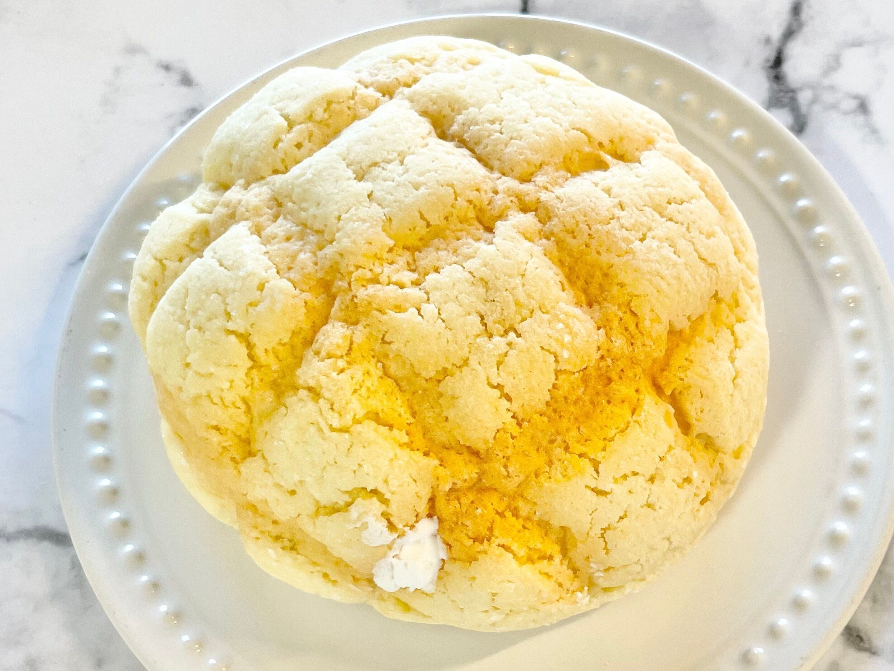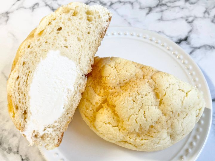 表面にサクサクとしたビスケット生地をかぶせたミルクホイップクリーム入りメロンパンです。
