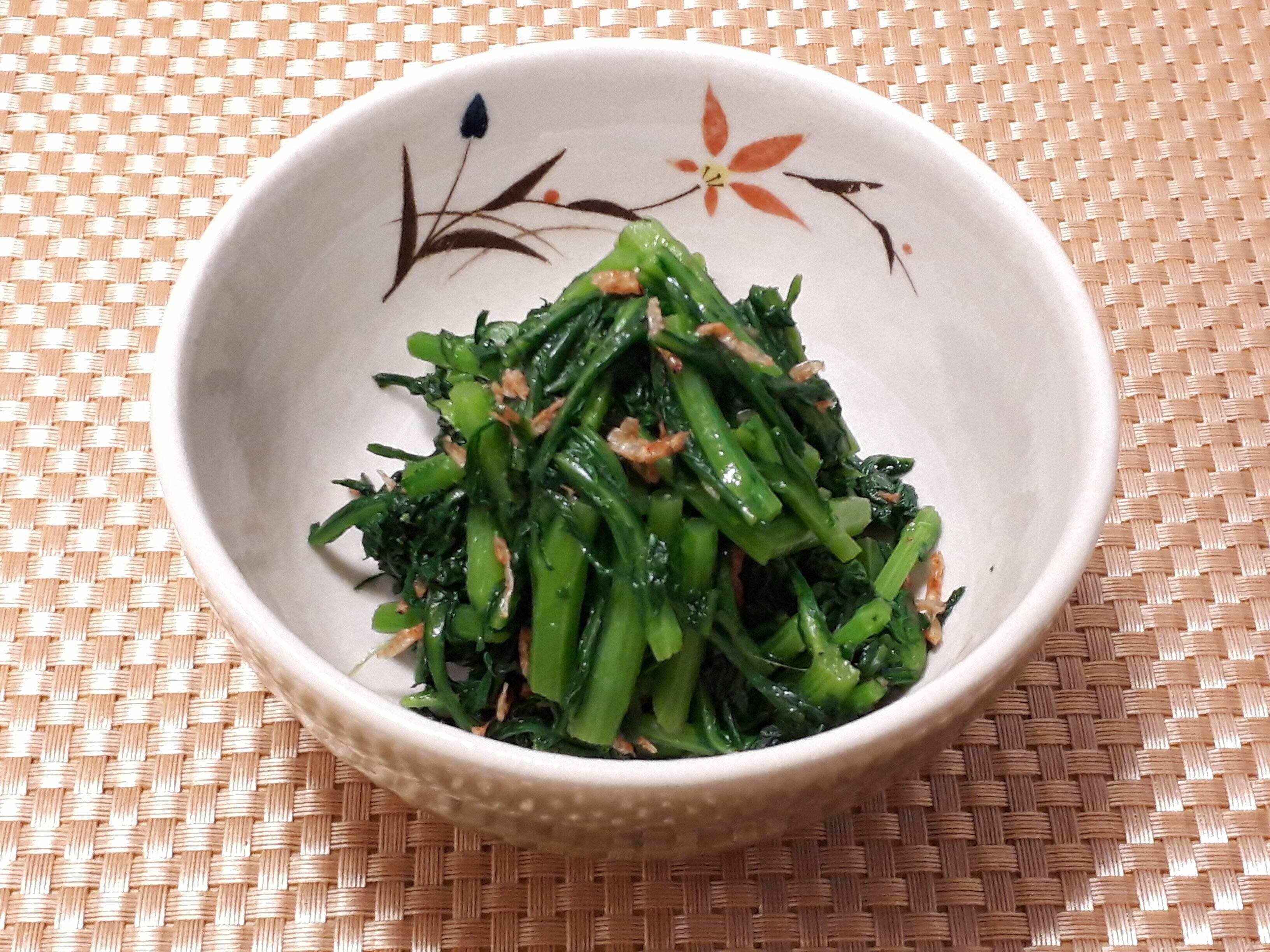 こちらの写真は、にんにくオイルにめんつゆ(濃縮タイプ)を混ぜ合わせたもので味付けした春菊と乾燥あみえびの和え物です。ニンニクオイルと鶏ガラスープを混ぜ合わせてゆで野菜を和えるとナムル風になったりとアレンジをいろいろ楽しめます。