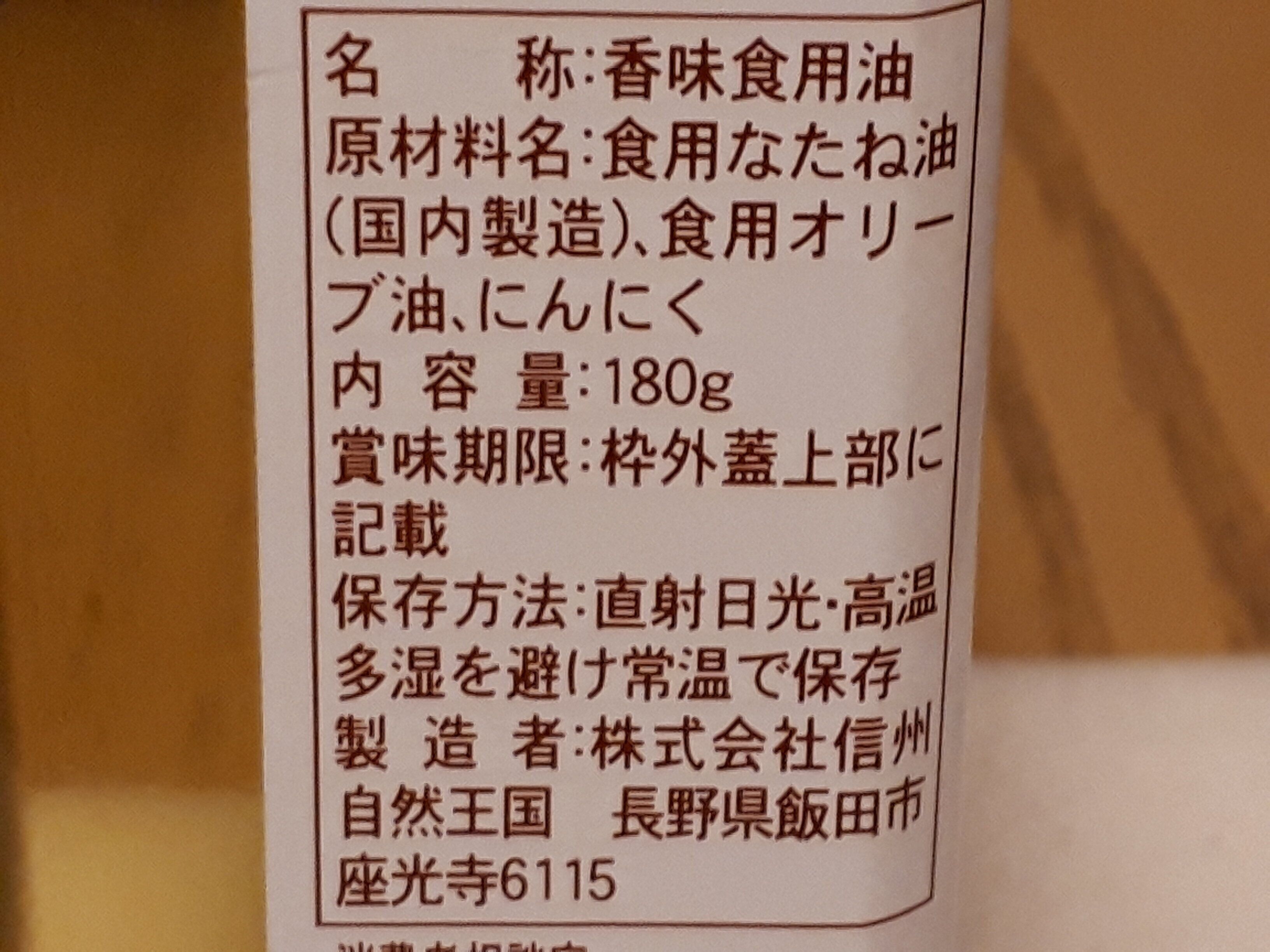 株式会社信州自然王国の「にんにくオイル」は、内容量180gで410円で販売されています。写真の原材料などを記載したラベルの反対側には、「食用オリーブ油でニンニクを炒め、エキスとフレーバーを油に浸透させ、さらにスライスニンニクを漬込みました。」という記載があり、そのとおり瓶の底にはスライスニンニクが入っています。
