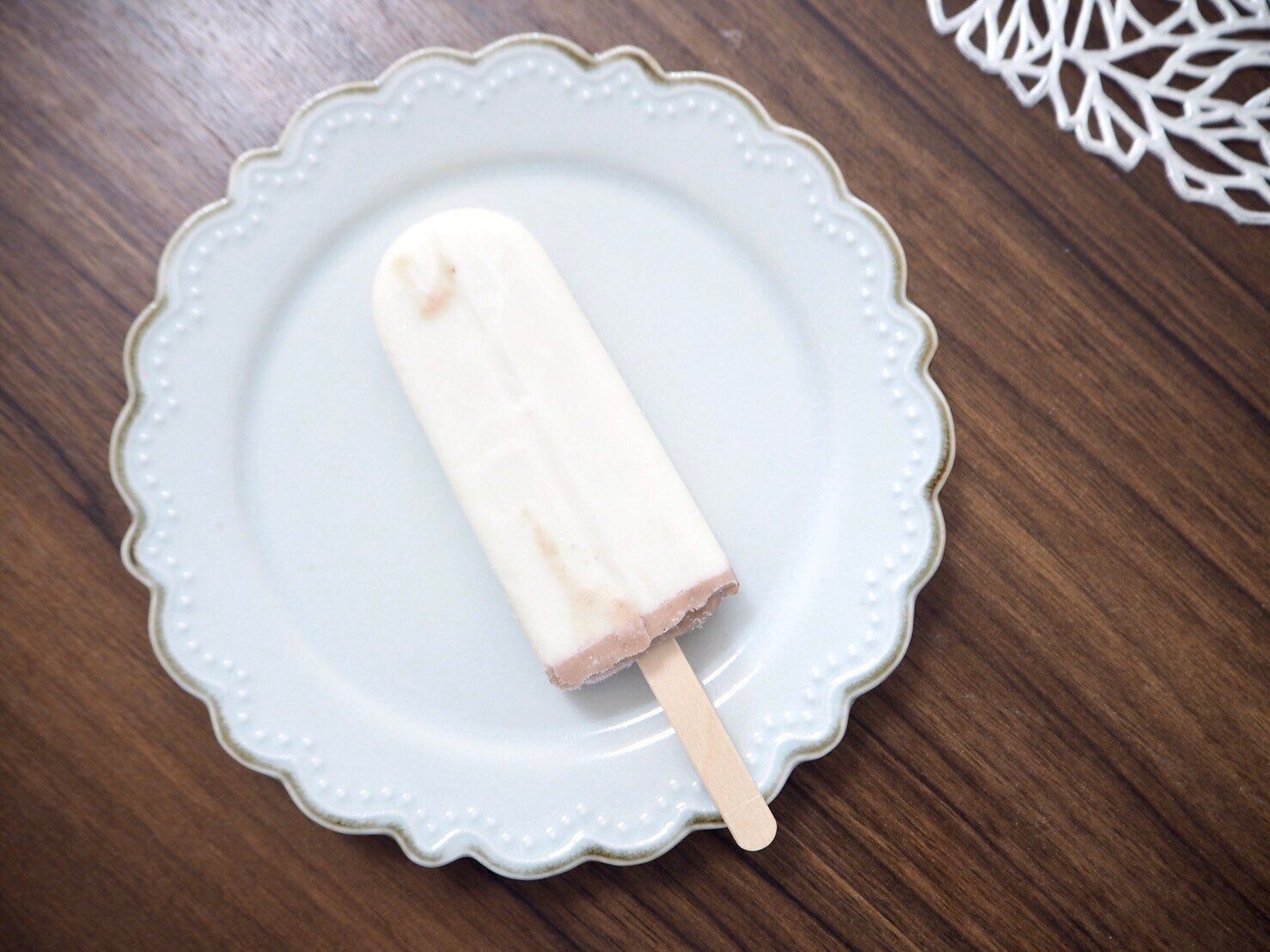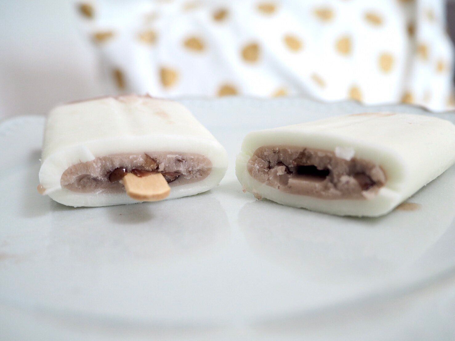 外側の白い部分は、北海道産練乳を使ったミルクアイス、真ん中の部分は自家製粒餡を混ぜ込んだあずきアイスです。