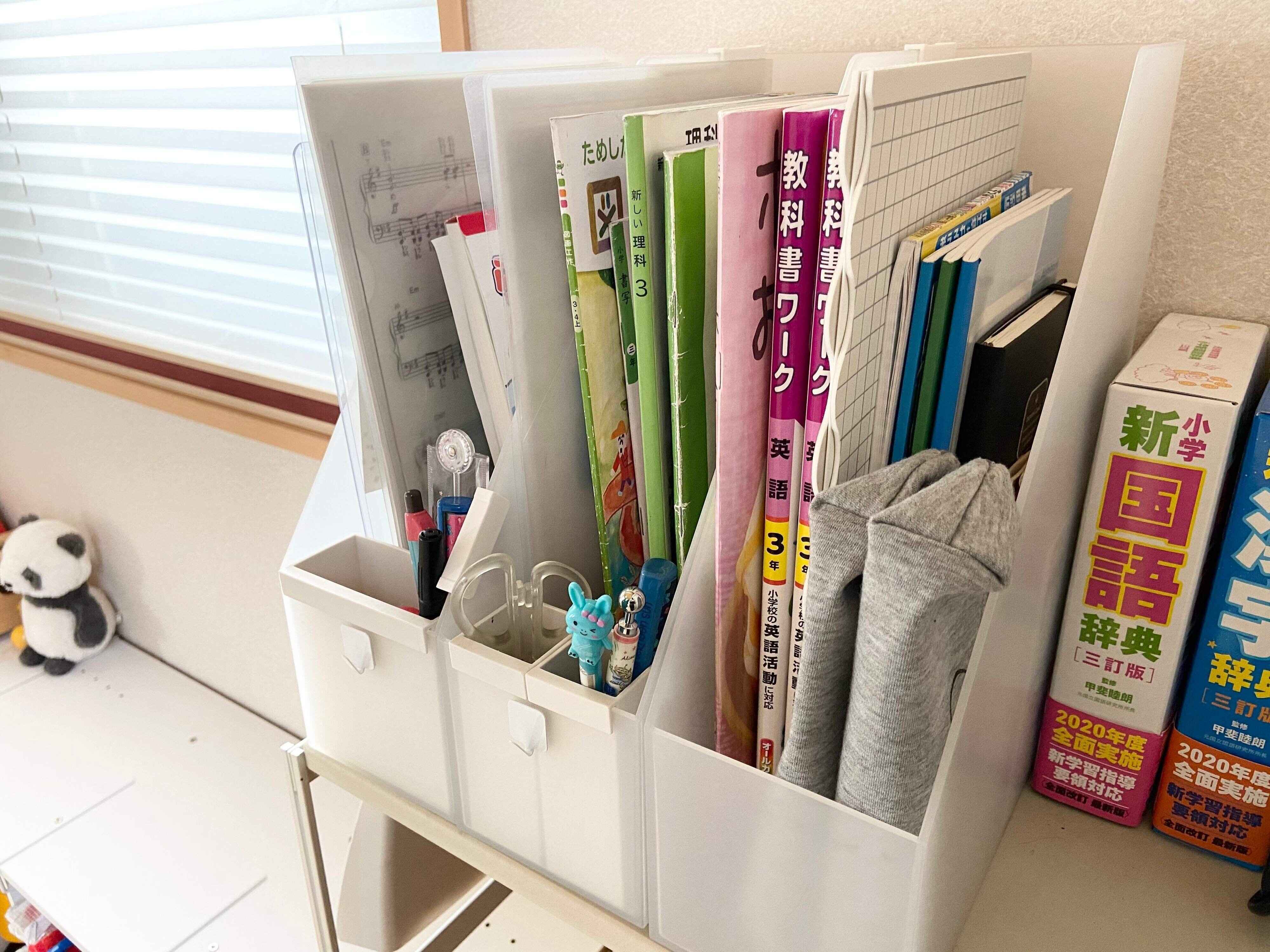 教科書類については、入学前はどれだけの場所を準備したら良いのか謎だったのですが、思った以上に小学校の教科書やノートは数が多くありません。我が家では無印良品のPPスタンドファイルボックス・A4用を使っていますが、今のところ一人1ボックスで管理できています。習い事や問題集用にもう1ボックスあると余裕が生まれます。