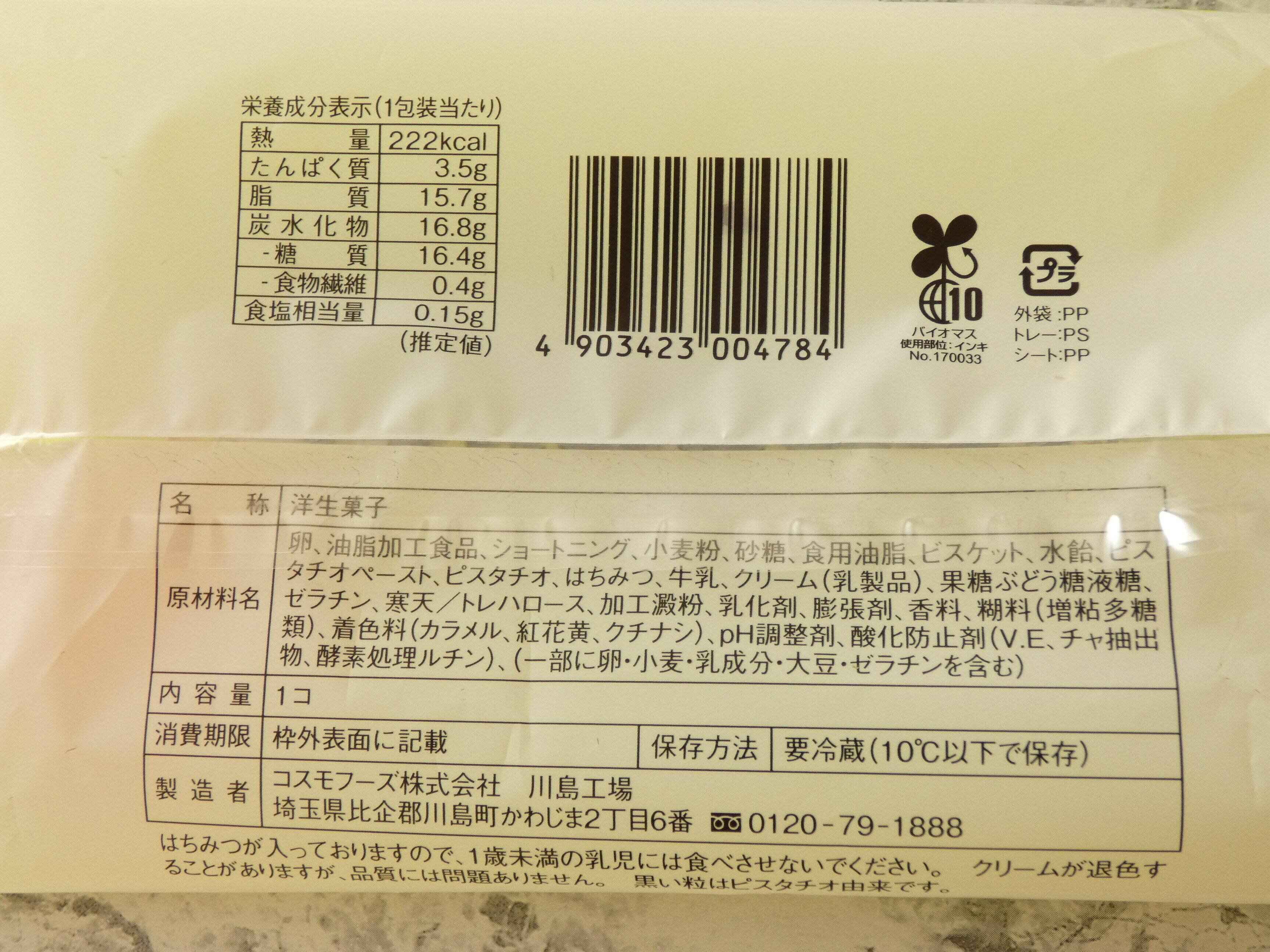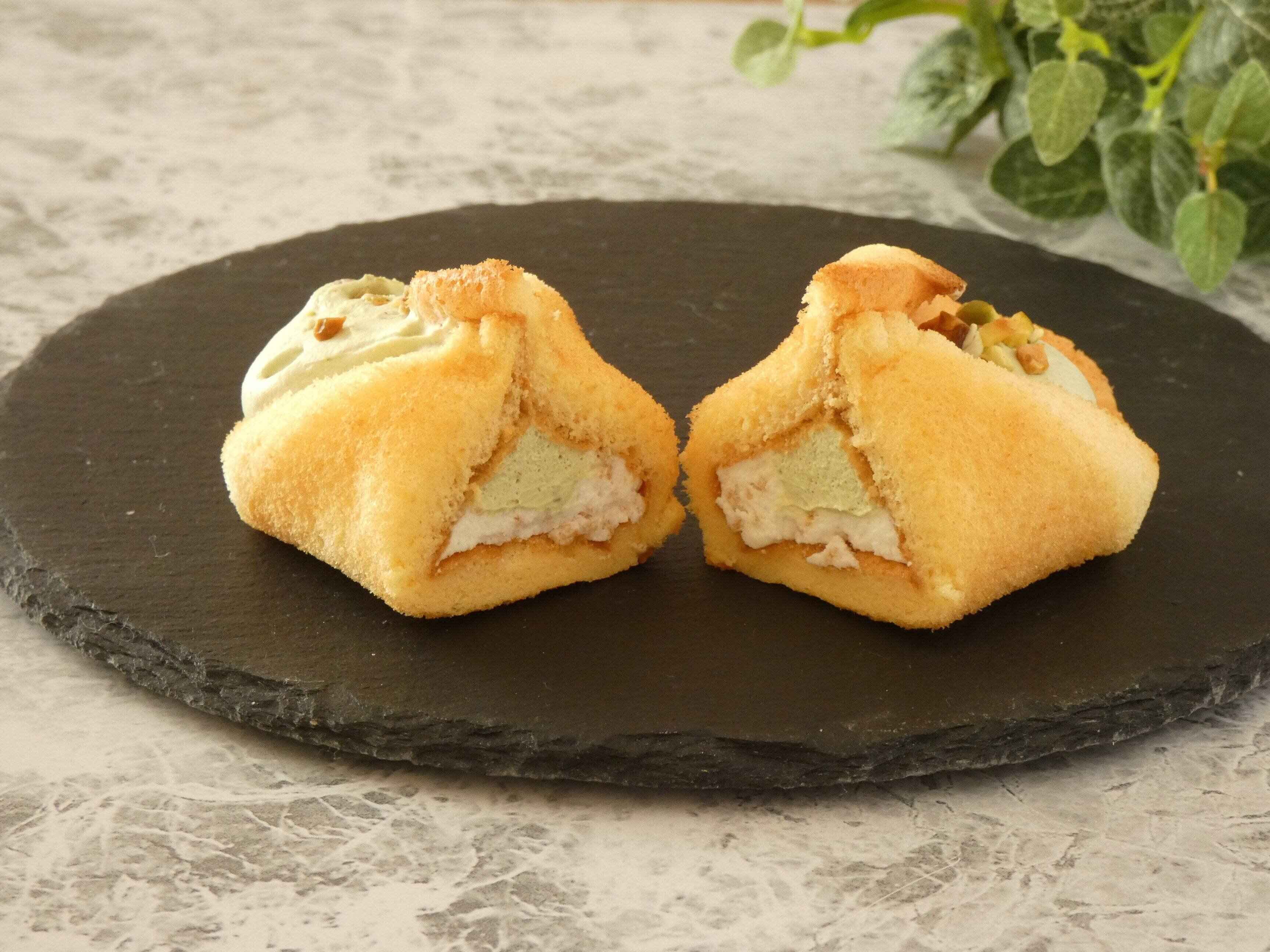 たっぷりのピスタチオクリームがスポンジにくるんと包まれていて、クリームにはピスタチオがたっぷり乗っています。