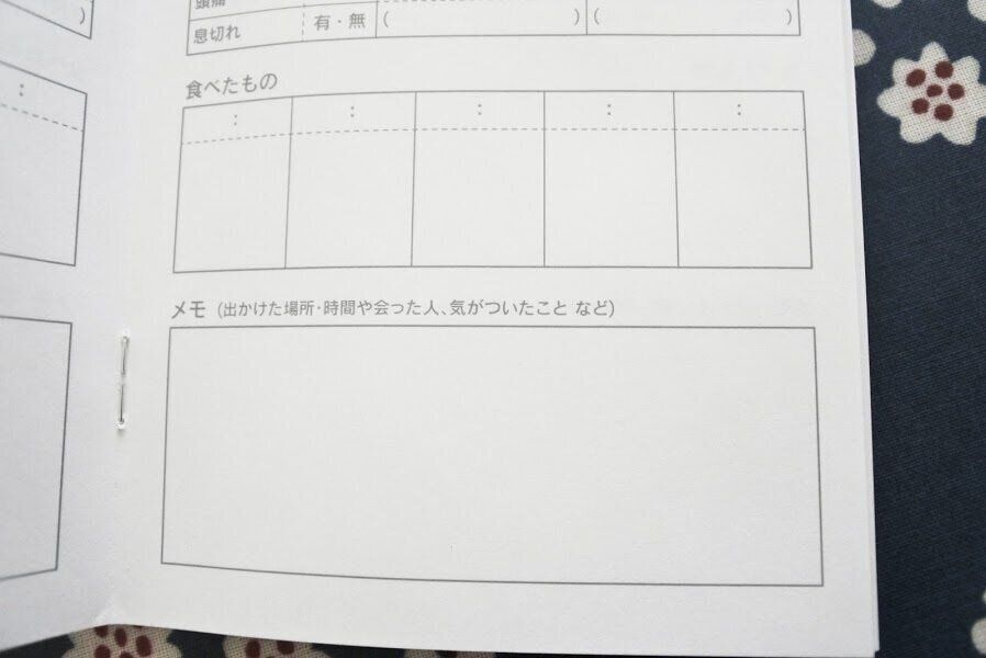下には食べたものの記録欄とメモする欄があるので、気づいたことなどを詳しく書いておくこともできますよ。病院へ行った時に口頭で医師に伝えるのって意外と難しくないですか?ついつい早口になってしまって言い忘れてしまったり…。