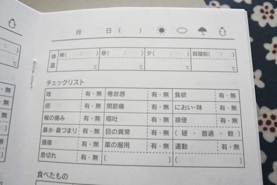 ノートには朝昼夕就寝前の体温記録。そして咳、倦怠感、においなど、15項目のチェックリストがあります。