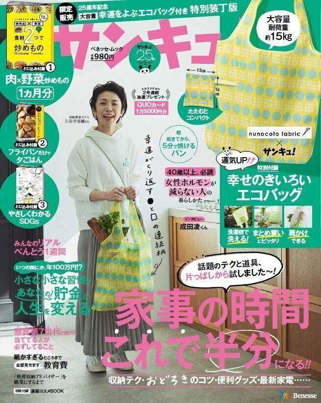 サンキュ!25周年記念特別付録のエコバッグは、大容量かつ丈夫なので、一週間分の食材をまとめ買いしたときにも活躍。