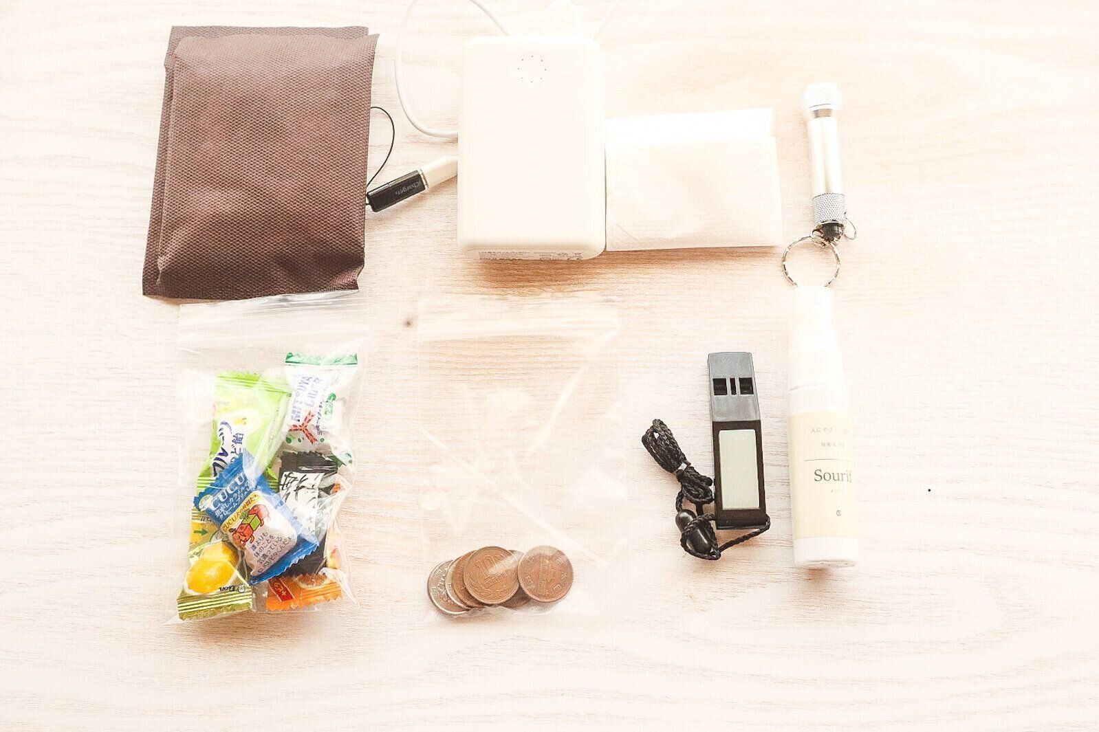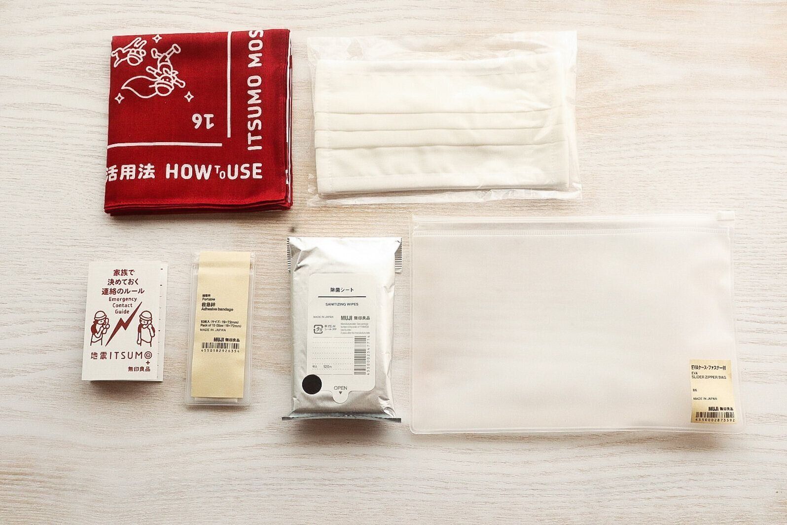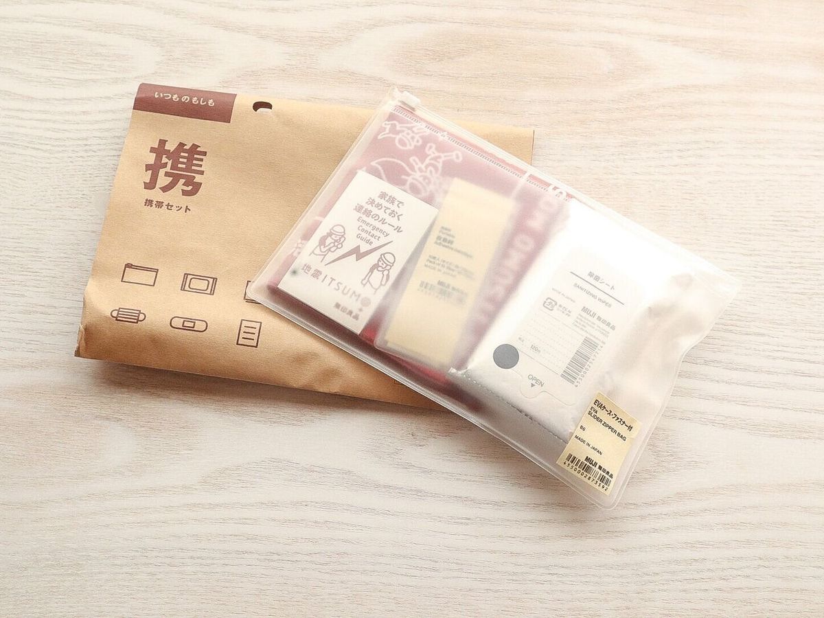 そこで、一から揃えるのではなく、「無印良品」の「いつものもしも携帯セット」に、わが家にとって必要なモノをプラスして用意してみました。