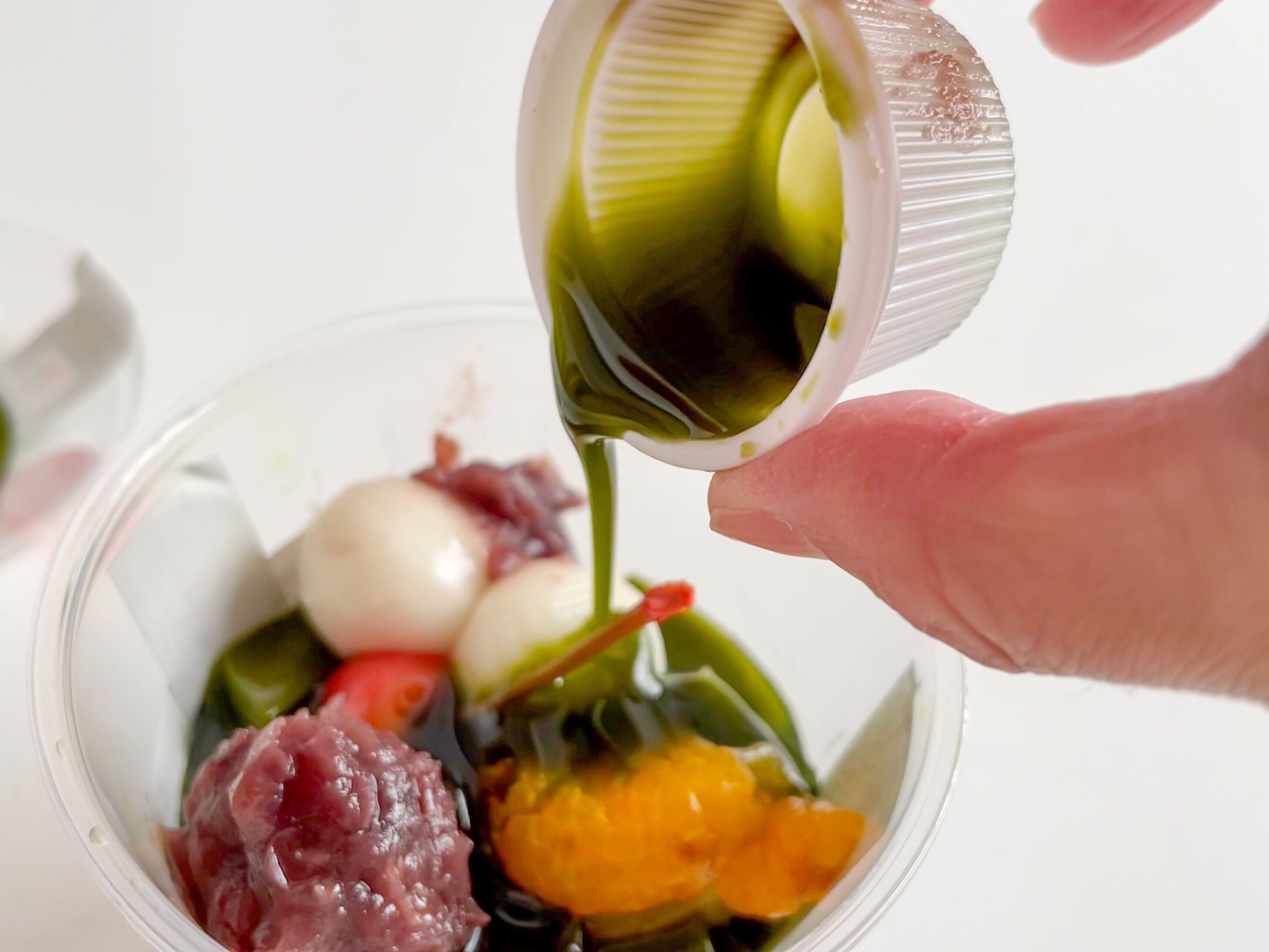 宇治抹茶ゼリーの上に中皿の具材をのせ、その上から濃いめの抹茶シロップをかけていただきます。