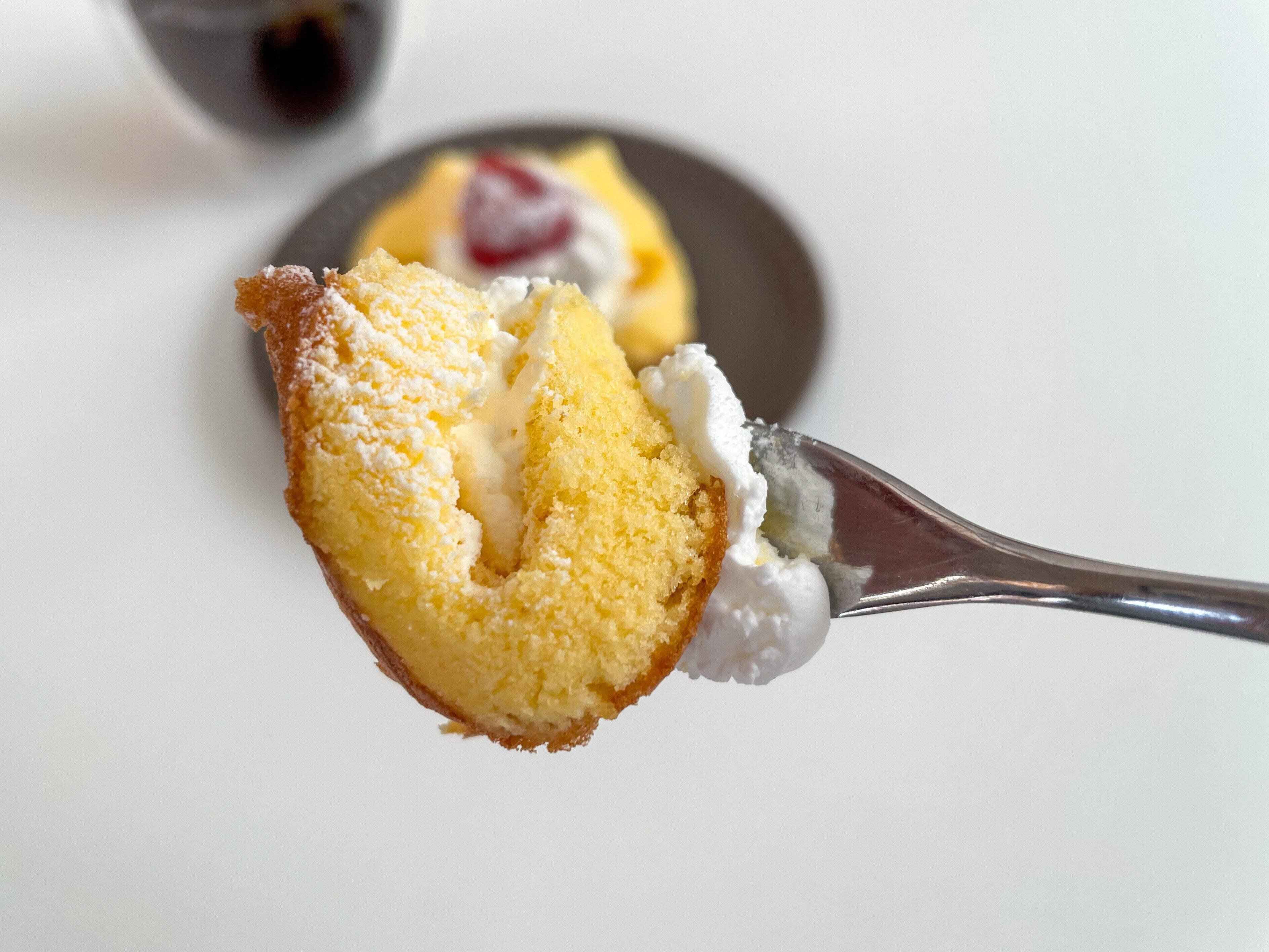 一口サイズを口の中へ入れてみると、ふわふわのスポンジとミルク感たっぷりの生クリームが口いっぱいに広がります。