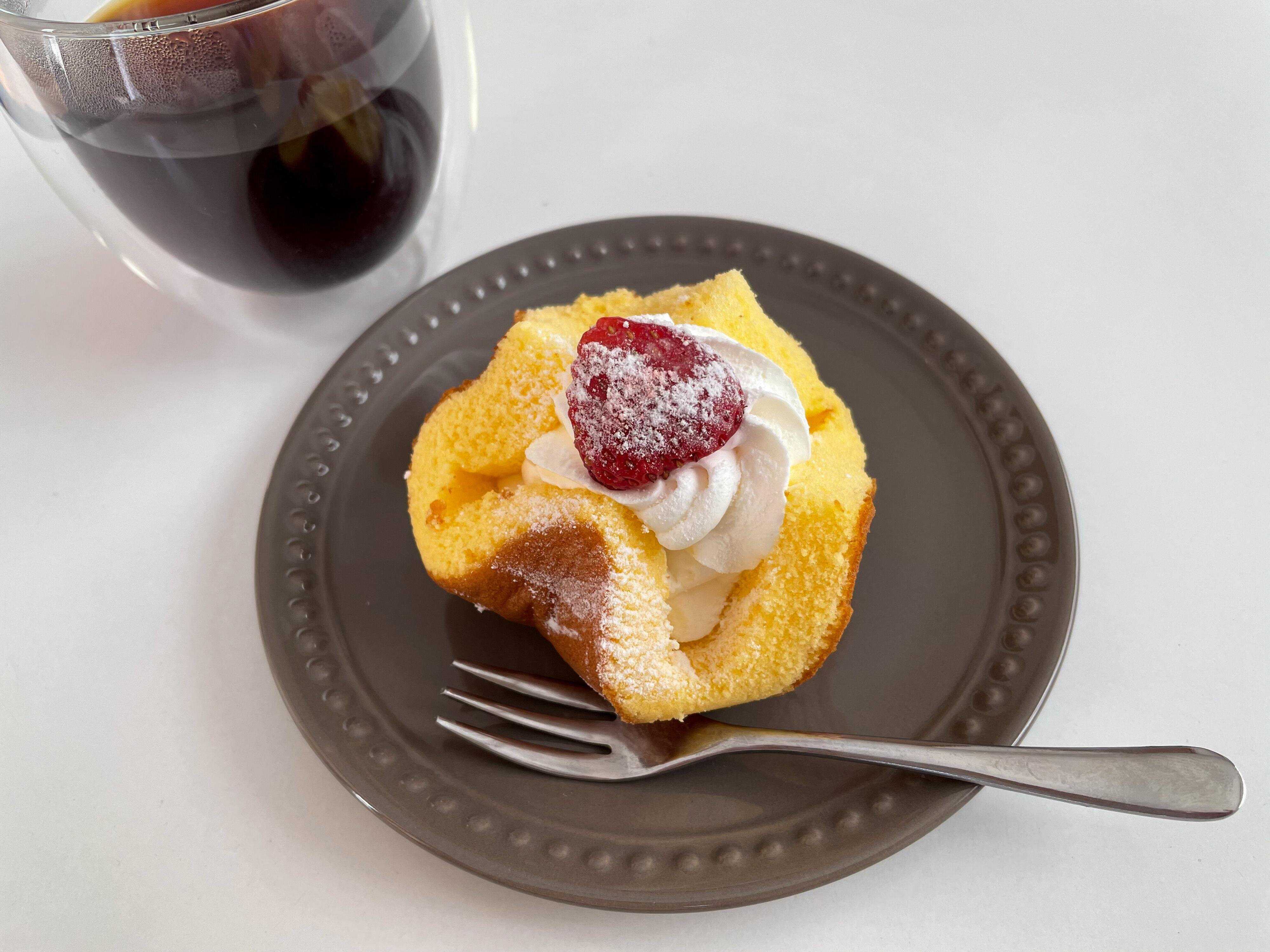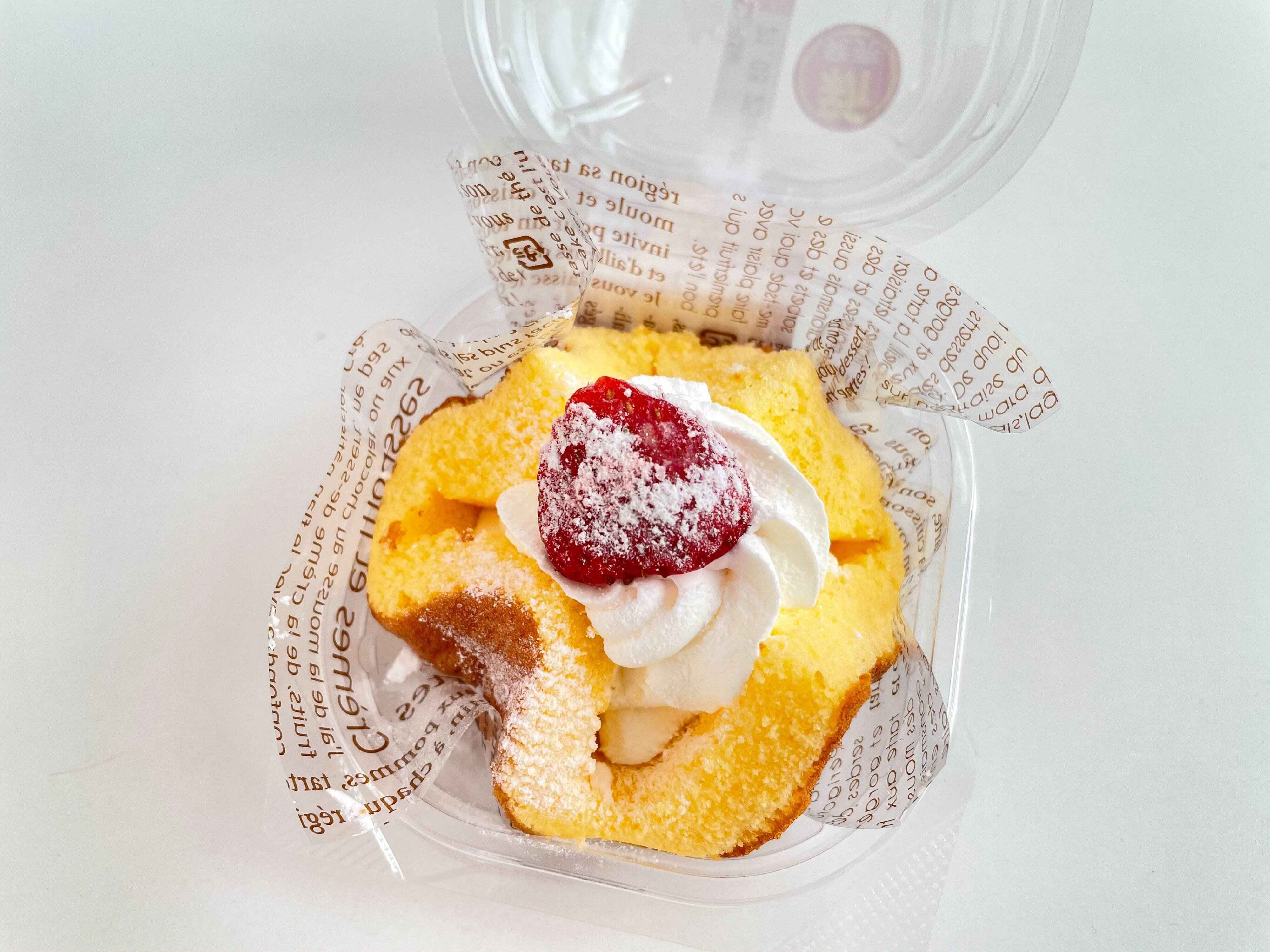 この季節、いちごがのっているだけで思わず手に取ってしまうのは私だけでしょうか?見た目もかわいい「いちごのふわふわケーキ」さっそく実食していきます。