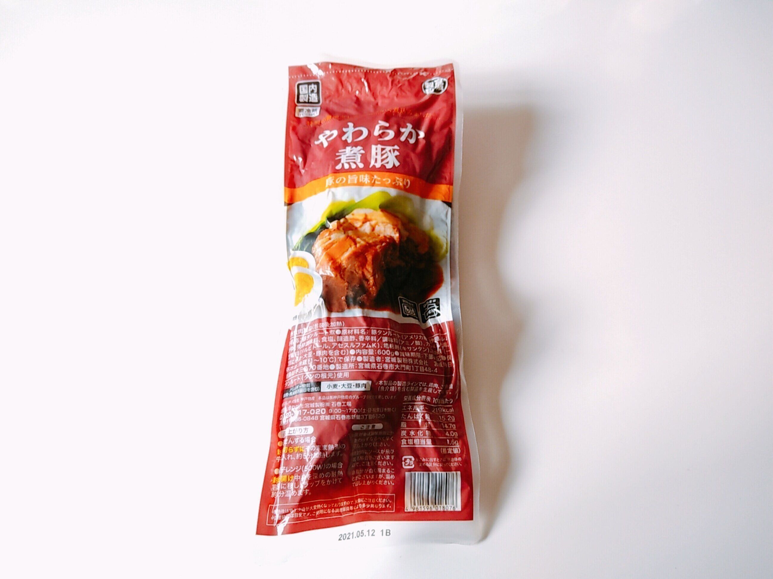 やわらか煮豚は、600g・496円。豚タンルートという舌の部位が、甘辛く味つけされています。レンジで温めるだけでメイン料理になるので、冷凍庫にあると重宝する商品です。