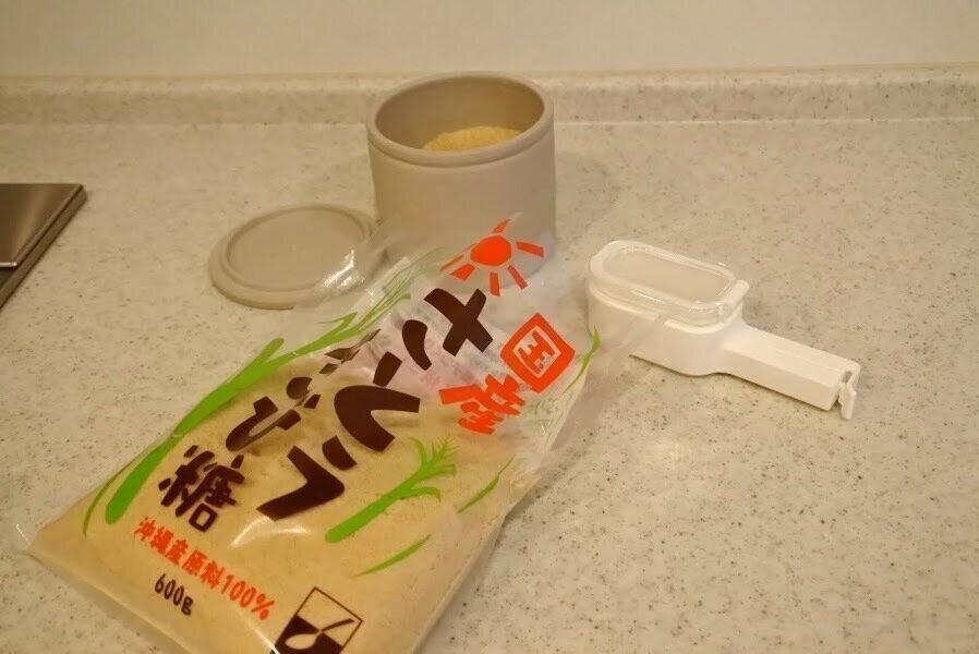 容器にサーっと詰め替えができます。一般的な袋クリップだと、毎回クリップをする時に袋の口についた砂糖が周りに落ちてしまいがちだけど、これなら袋の口に砂糖が付くこともないので注いだら蓋をしめて終了!かなりラクに詰め替えができました。