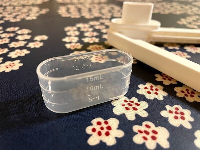 キャップは計量カップになっていて、小さじ1(5ml)小さじ2(10ml)大さじ1(15ml)が量れるようにようになっていますよ。