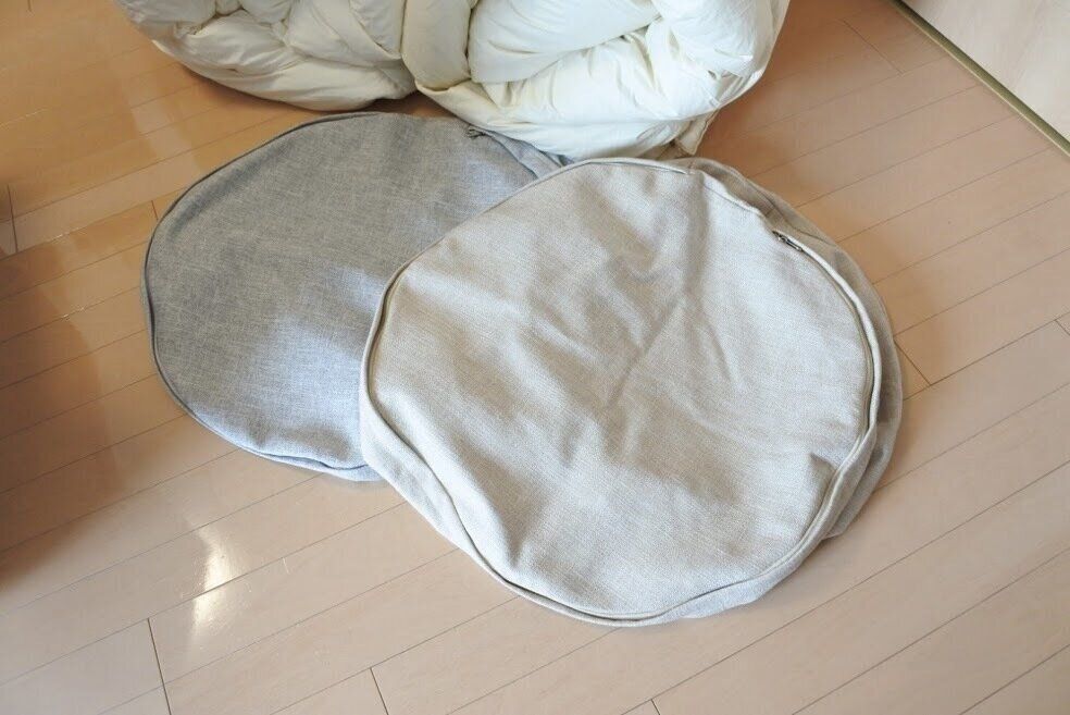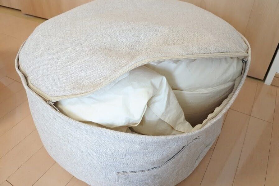 掛け布団のみをケースに入れていますが、クッションをパンパンにして使いたい場合はシーツや敷きパッドをいっしょに収納しておくとしっかりとしたクッションが出来上がります。