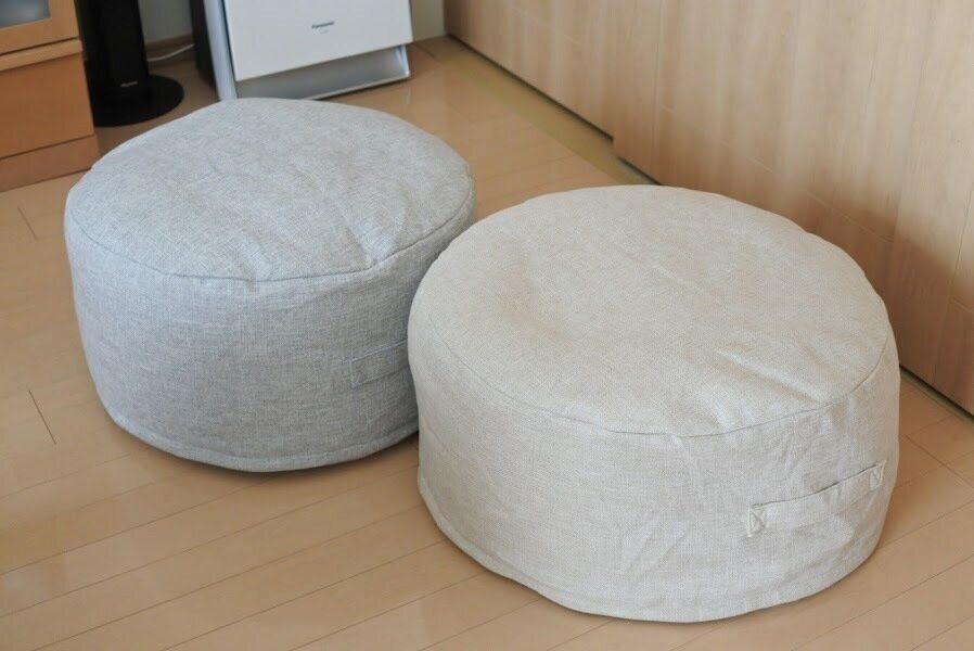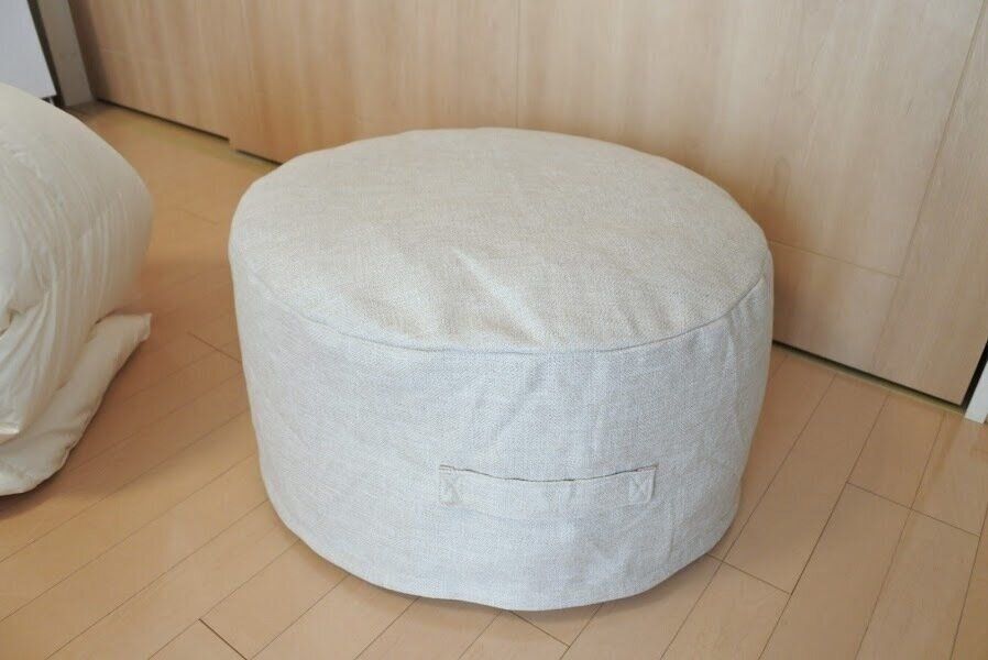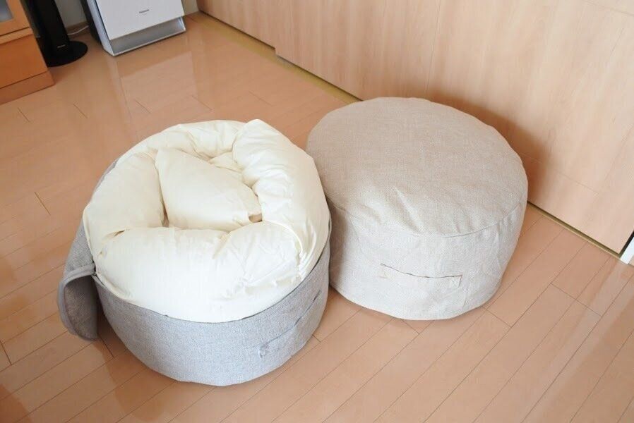 クッションに変身!!サイズは直径58×高さ28cmなので大きめのクッションになります。素材もソファに使われるしっかりとした凸凹素材なので、中に掛け布団が入っているとは気づかれないと思います。