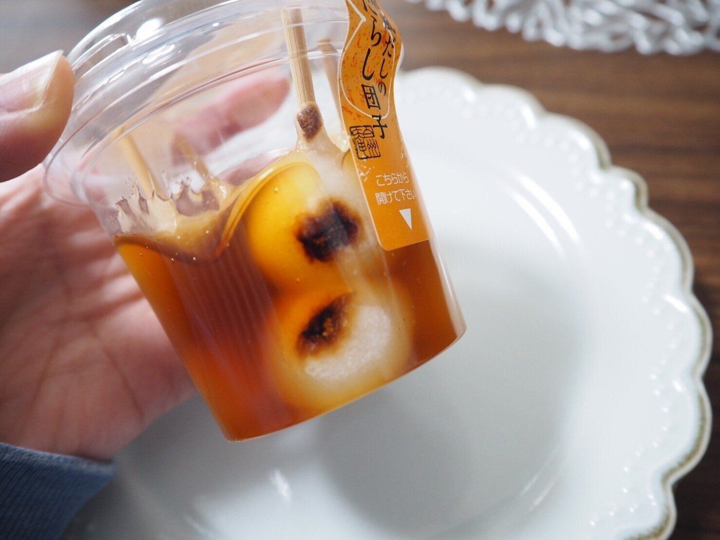 1カップに4本のみたらし団子が入っていて、カロリーは244kcal。1本には小さめサイズのお団子が2つです。