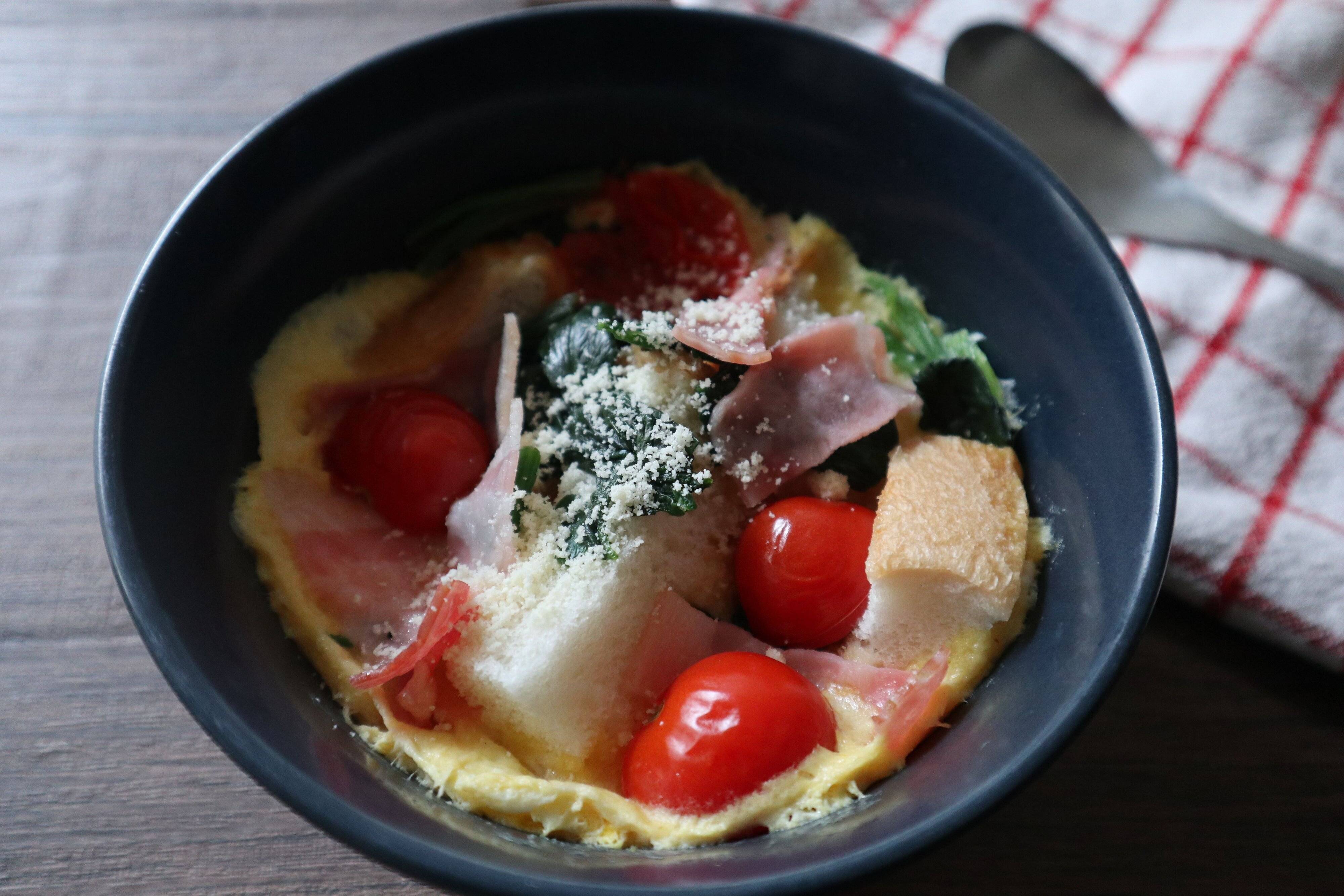 1.スープカップにAをいれて、混ぜる。食パン、ベーコン、ミニトマト、ほうれん草を加える。
