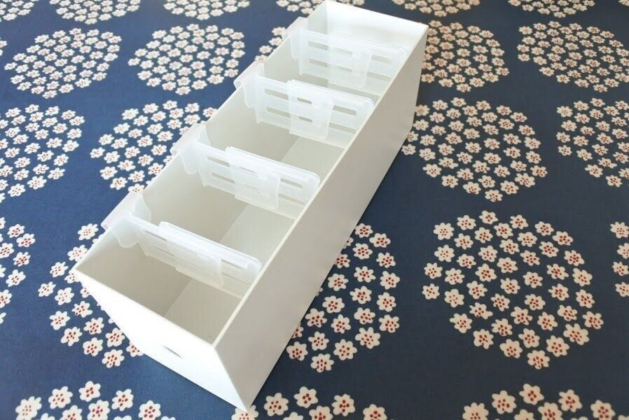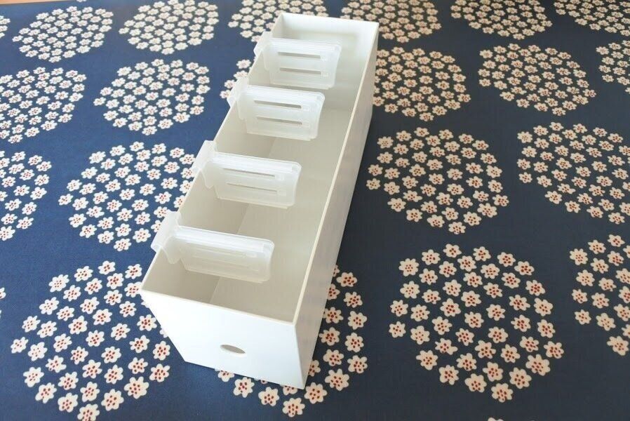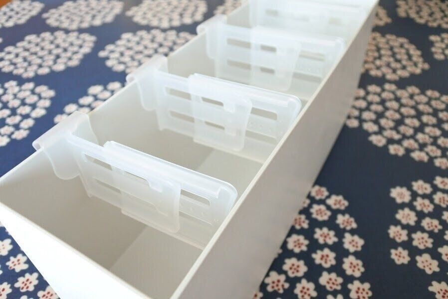 このポケット仕切り、無印のファイルボックスや100均のケースにも取り付けられるのですごく便利なんです。このように取り付けて