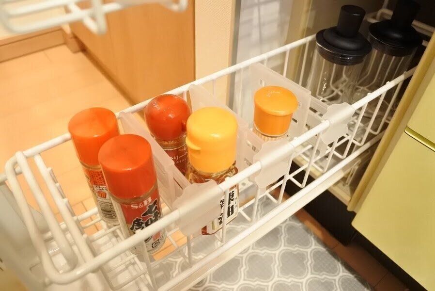 我が家のスパイスラック。引き出す度にスパイスが倒れてしまう。これちょっとプチストレスだったのですが、ポケット仕切りをこのように取り付けてみたら