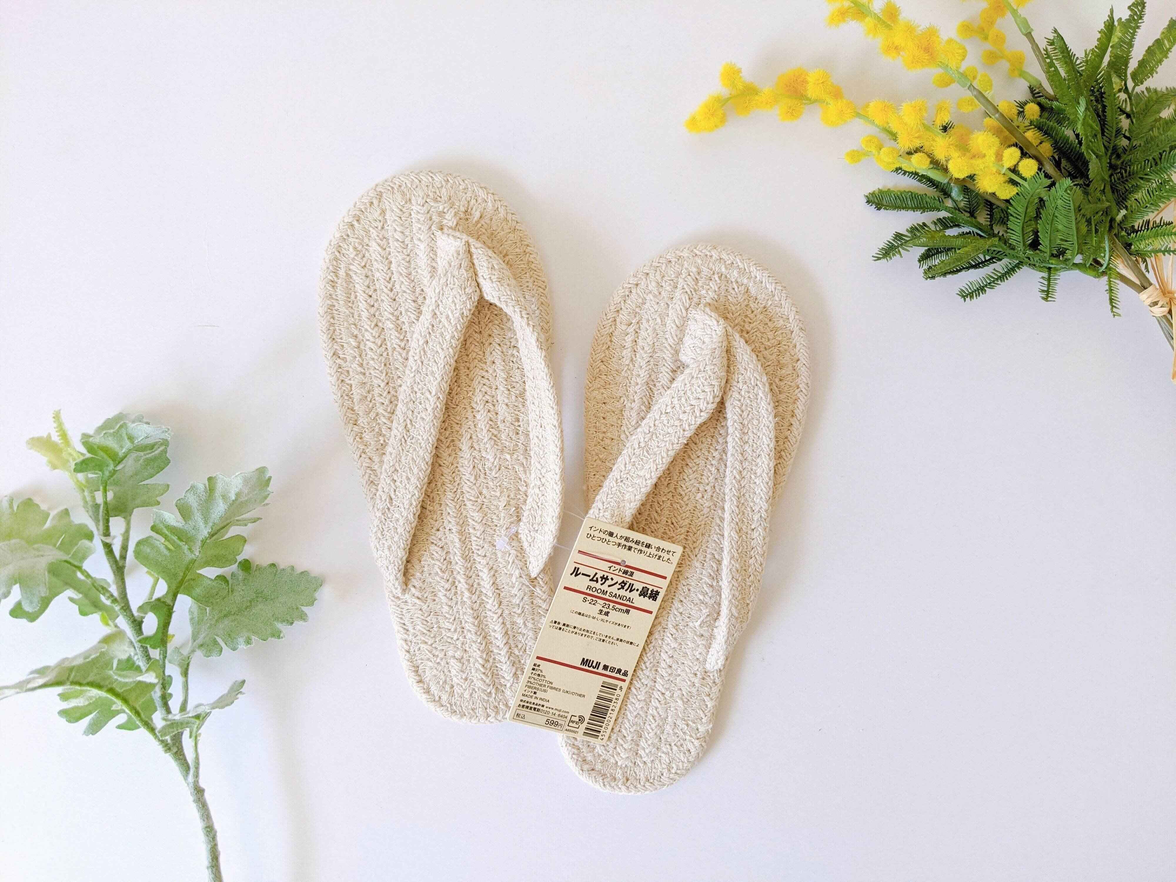 サンダルタイプで指先が出るので涼しく、インド綿なので履き心地もサラリとして気持ち良いです。無印良品の商品説明では「ラグの上を歩いているような履き心地」。まさにその通り!