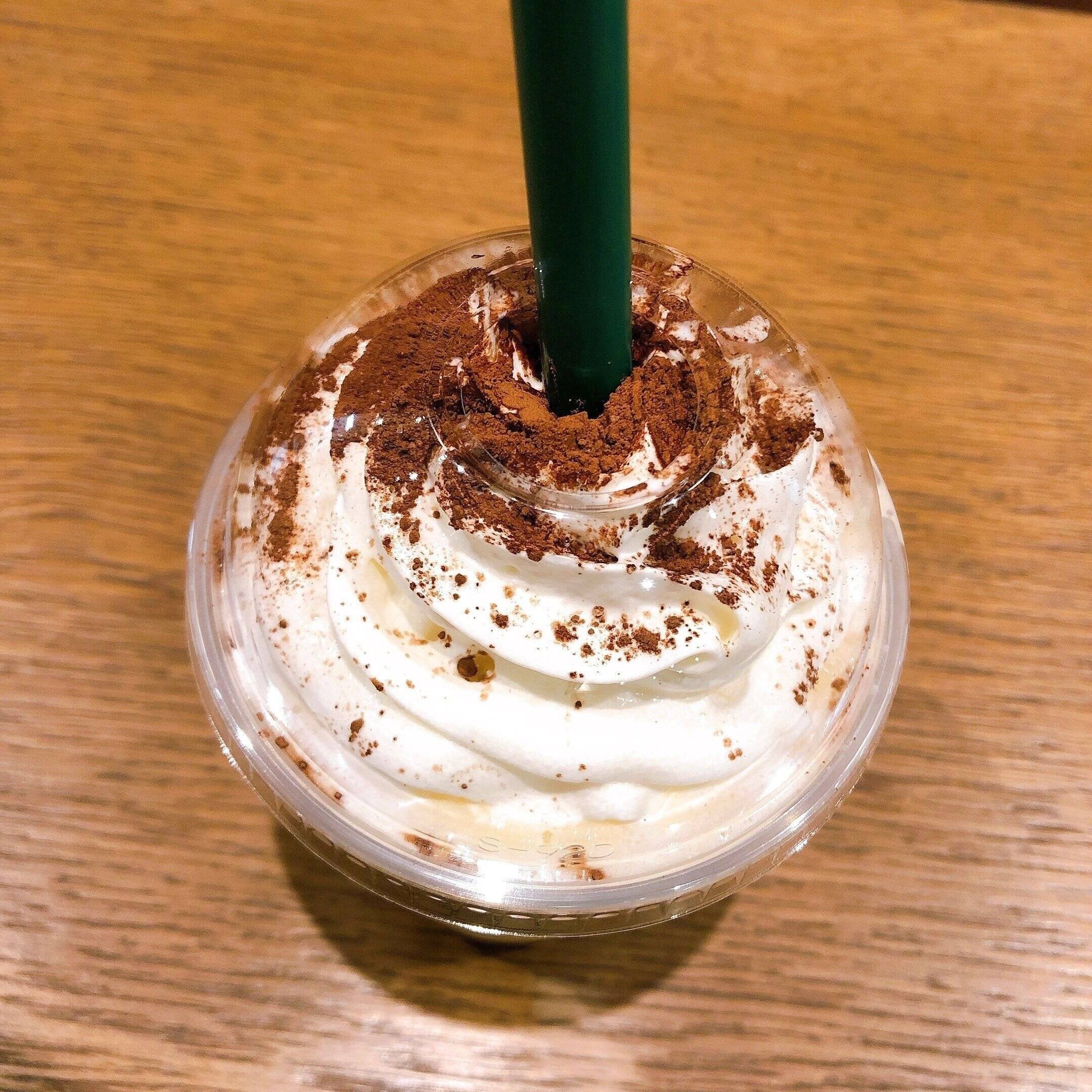 店内でドリップされたコーヒーに漬けたスポンジの上に、カスタードミルクベースのフラペチーノ!ホイップクリームの上にはココアパウダー。