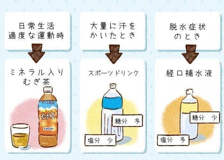 生活シーンや体調に合わせて飲み物を選ぶ工夫も必要です。日常生活や、適度な運動時、暑さ対策飲料としては、無糖でカロリーゼロ、カフェインゼロのミネラル入りむぎ茶がおすすめ。エネルギーを消費し、大量に汗をかいたときは、糖分を多く含むスポーツドリンクを。脱水症状には経口補水液が効果的です。ただし、経口補水液は塩分が多く、予防的に飲むと塩分の過剰摂取になってしまうので、医師の指示のもと飲んでください。