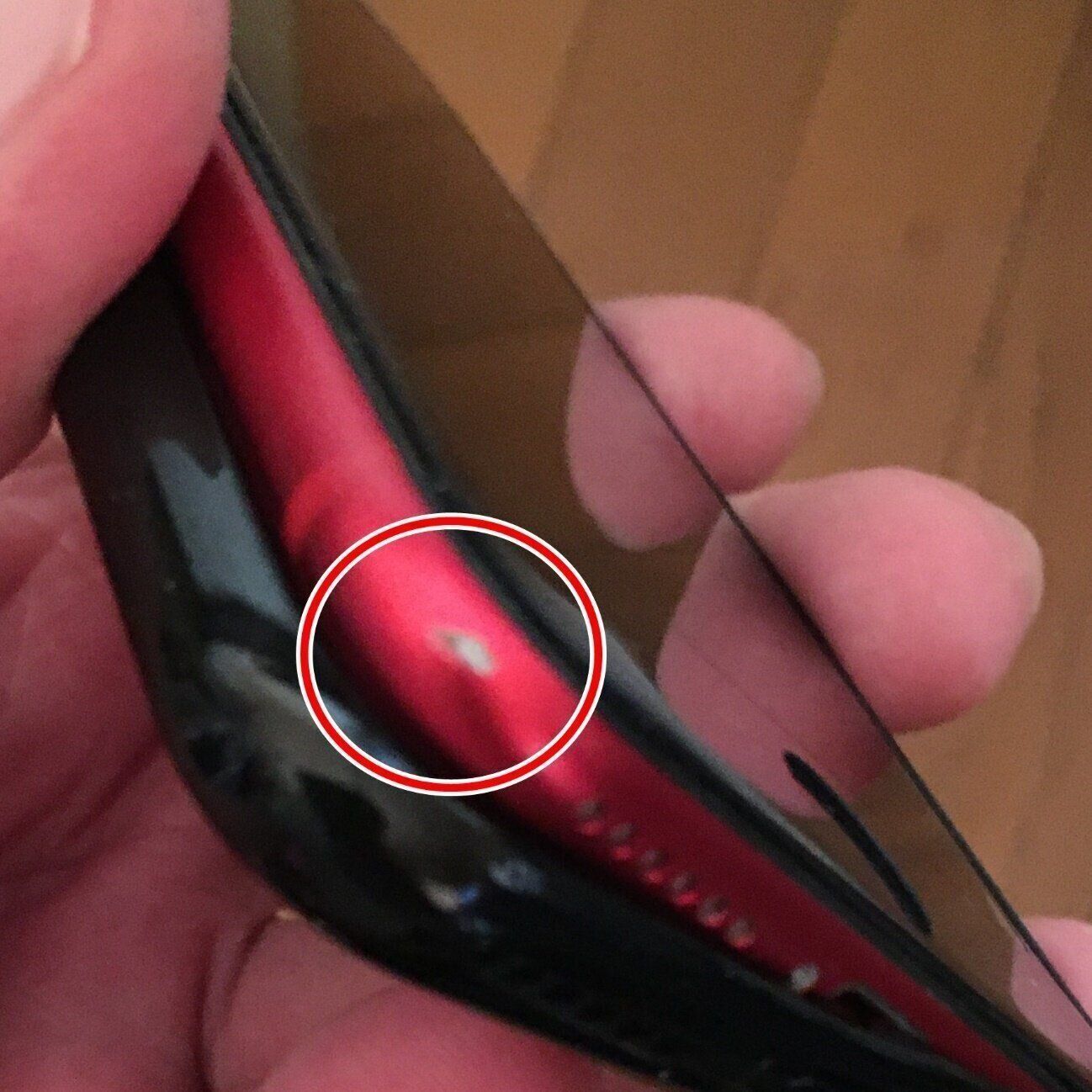 写真のとおり筆者のiPhoneは真紅のカラー。きれいな赤を隠したくなかったので、とてもうれしい。背面の角にケースの黒が入ってしまいますが、これはこれでデザイン的にカッコいいと思います。