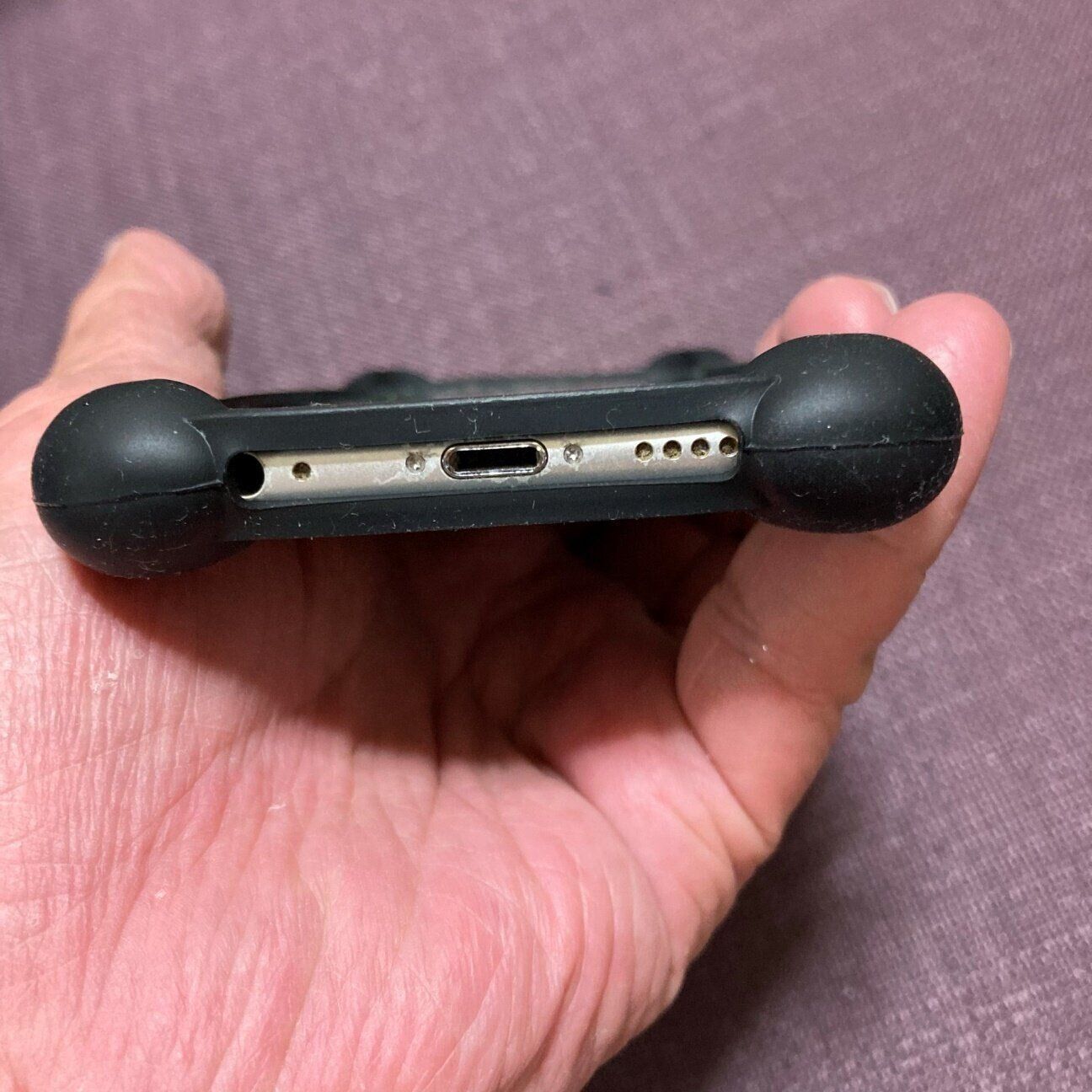 四隅に丸くて大きなゴムがついているのがやや目立ちますが、この丸い部分が、落下の強い衝撃を吸収してスマホを守ってくれるのですね。