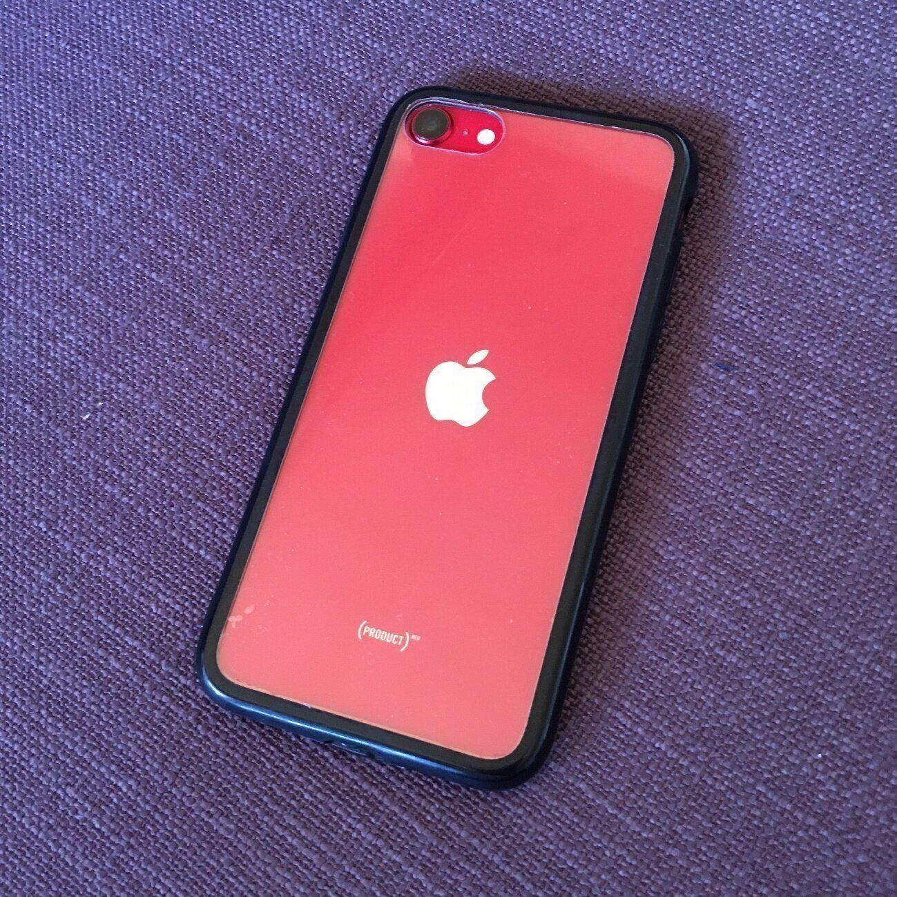 このスマホケースの背面はアクリル製。透き通った美しいアクリルを使用していることがこの製品の特徴で、装着すると本体裏面のアップルマークや本体の色が、メチャクチャ映えます。ちなみにパッケージにはiPhone 7/8用と書かれていますが、同じデザインの第2世代iPhone SEでも使えました。