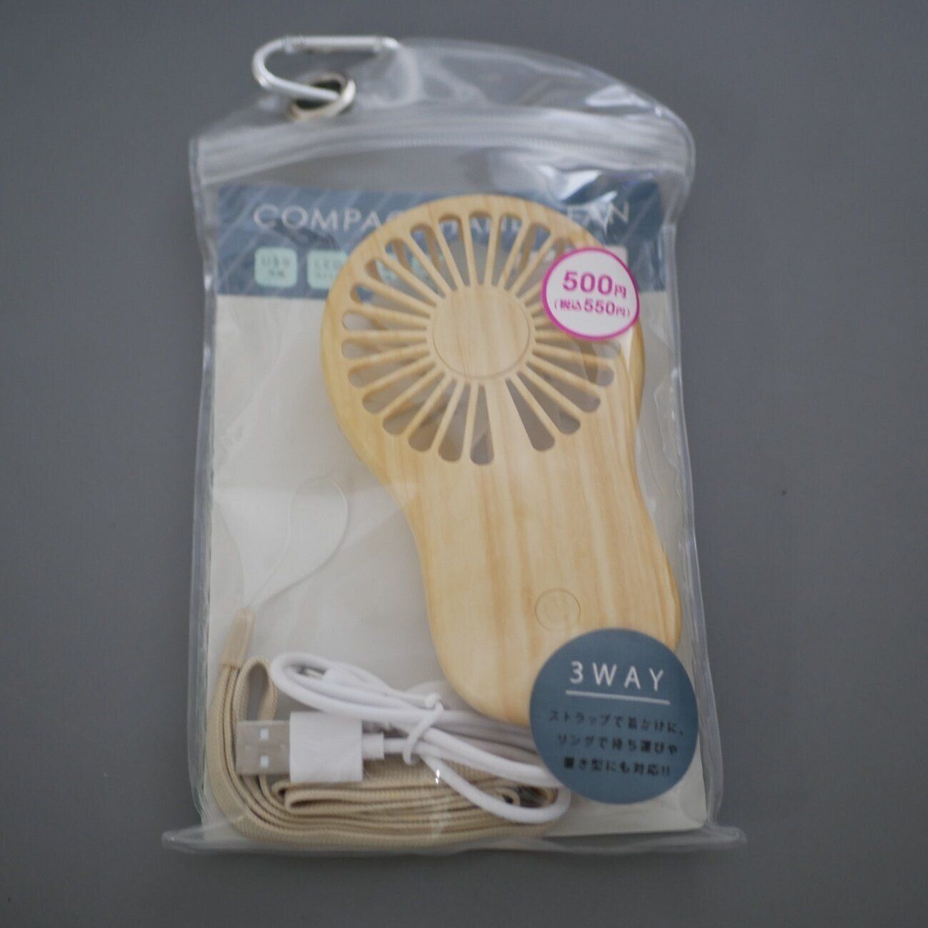 今回ご紹介するのは、ダイソーで販売されている「コンパクトハンディファン」。価格は550円です。スーパーで売っている同じような製品と比較しても、わずかですが安い。