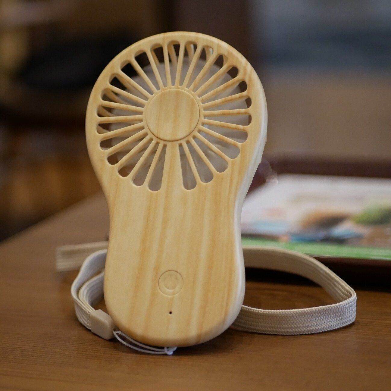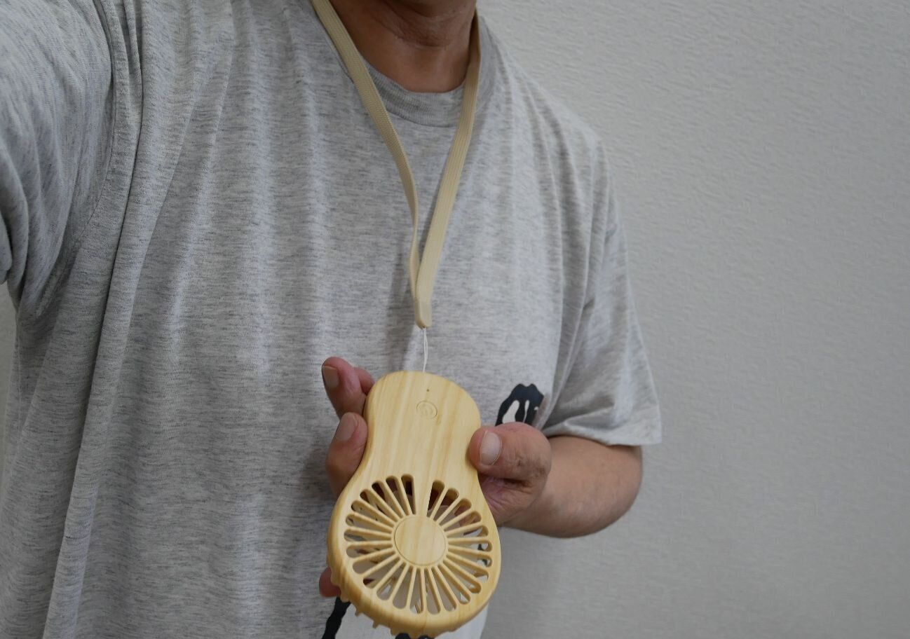 ネックストラップにつけて首からぶら下げておけば、いつでも持ち歩きできます。リングを貼っておけば、休憩場所の机に置いて携帯扇風機として使えます。